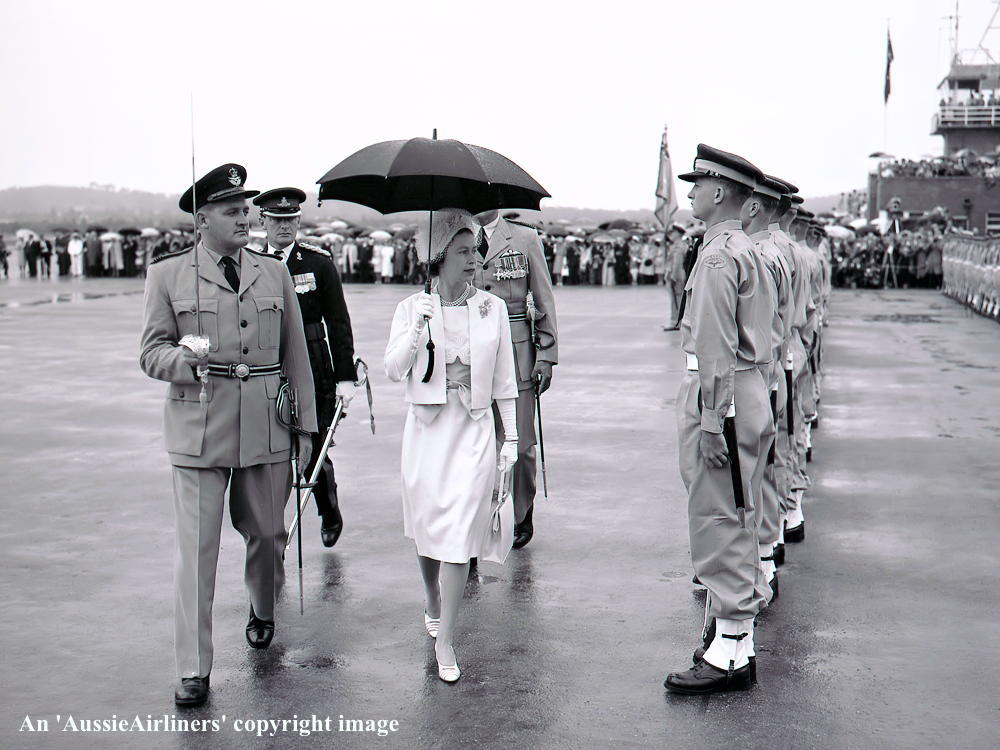 Queen Elizabeth II inspects the 'Guard of Honour' at Canberra Airport, February 1963. (Qantas Heritage Collection Copyright Image 4605-183.) |