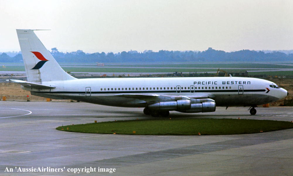 CF-PWW. Pacific Western - in the standard livery at an unknown airport, circa 1970. (R. N. Smith Collection Copyright Image 4605-451.) |