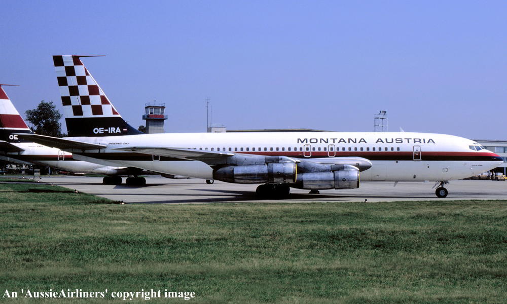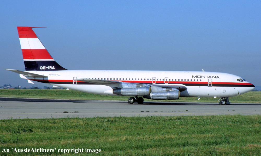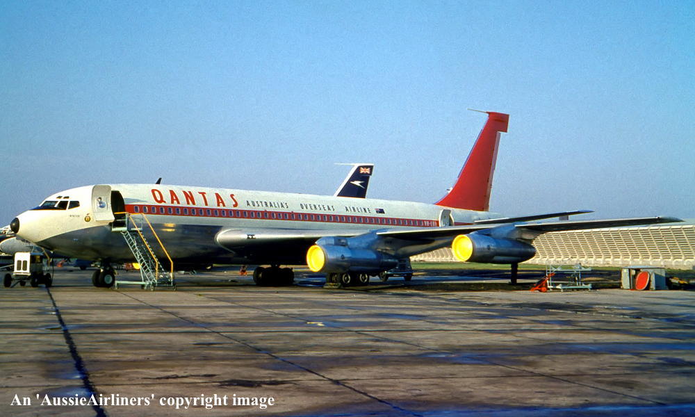 This aircraft was constructed at Seattle (Renton) as a 707-138B - June 29, 1961 First flown as VH-EBI - August 07, 1961 Entered onto the Australian Aircraft Register as VH-EBI - August 16, 1961 Registered to Qantas Empire Airways Ltd, Sydney Accepted by R. Yates for Qantas Airways at Seattle (Renton) - August 16, 1961 This aircraft was the ninth Boeing airliner delivered to Qantas Airways It was the 9th Boeing 707 delivered to Qantas Departed Seattle (Boeing Field) on the positioning flight to San Francisco - August 17, 1961 Operated its first revenue service San Francisco - Sydney (Kingsford Smith) - August 17, 1961 It arrived at Sydney (Kingsford Smith - 06:11 local) on completion of the delivery flight - August 19, 1961 It established a record for the San Francisco - Sydney sector of 13 hours 44 minutes It established an unofficial record for the Honolulu - Sydney sector of 9 hours 28 minutes Delivery route: Seattle - San Francisco - Honolulu - Nadi - Sydney Flight crew: Captains A. A. E. Yates, F. Fox This aircraft was delivered in the 'experimental' or interim livery It was named 'Winton' It operated the inaugural 707-138B service Sydney - Tokyo via Manila and Hong Kong - November 14, 1961 It operated the inaugural Sydney (Kingsford Smith) - London (Heathrow) service via Vienna - March 31, 1965 It operated the inaugural Brisbane - Manila - Hong Kong service - April 03, 1965 It operated its first troop charter to Tan Son Nhut Airport, Saigon for Australian Defence Force - May 31, 1965 Operated its final revenue service Sydney - Auckland - Sydney - September 03, 1968 Withdrawn from use and stored at Sydney (Kingsford Smith) Sold to Braniff International Airways - June 07, 1969 Entered onto the United States Aircraft Register as N105BN - June 1969 Departed Sydney (Kingsford Smith) on the ferry flight to Dallas, Texas in Braniff's cherry-red livery - June 24, 1969 Cancelled from the Australian Aircraft Register - June 25, 1969 It arrived at Dallas on completion of the ferry flight - June 28, 1969 Withdrawn from use by Braniff International and stored - September 26, 1973 Traded in to Boeing - 1974Registered to Great American Insurance Company - January 1975 Delivered to Boeing - November 01, 1975 Delivered to Atlas Air Systems, Miami, Florida - August 18, 1976 Sold to Montana Flugdienst GMBH, Austria - September 17, 1976 Ferried to Stansted, England in Braniff's green livery - October 02, 1976 Entered onto the Austrian Aircraft Register as OE-IRA - October 1976 Delivered to Montana at Vienna, Austria - October 30, 1976 Leased to Aer Lingus in the Montana livery for a brief period - June 1977Leased to Alitalia in the Montana livery with 'Operated by Alitalia' sticker - November 01, 1978 Returned to Montana at the end of the lease - March 31, 1979Leased to Central Airways, Nigeria for Hadj flights - August 1980 Leased to Central Airways, Nigeria with their red-white chequered tail - April 1981 Operated its final Montana revenue service New York (JFK) - Vienna - July 27, 1981 Withdrawn from use and stored at Vienna with Central titles on L.H.S. & Montana on R.H.S. - July 28, 1981 Cancelled from the Austrian Aircraft Register - October 1981 Sold to Air Lease Egypt and ferried to Stansted as 'OE-IRA' for maintenance - November 14, 1982 Departed Stansted on delivery to Air Lease, Cairo - December 17, 1982 Entered onto the Egyptian Aircraft Register as SU-FAB - March 1983Leased to Egypt Air - March 1983 to August 1983 Transferred to Misr Overseas Airways when Air Lease was renamed - January 1984 Sold to West Coast Airlines - July 1985 Sold to Air Crew Leasing Inc, Washington, DC - June 1986 Entered onto the United States Aircraft Register as N245AC - ? Sold to Boeing Military Airplane Company - June 30, 1986 Cancelled from the United States Aircraft Register - August 1986 Scrapped with parts used for the KC-135E refurbishment program at Tucson, Arizona - 1991 |