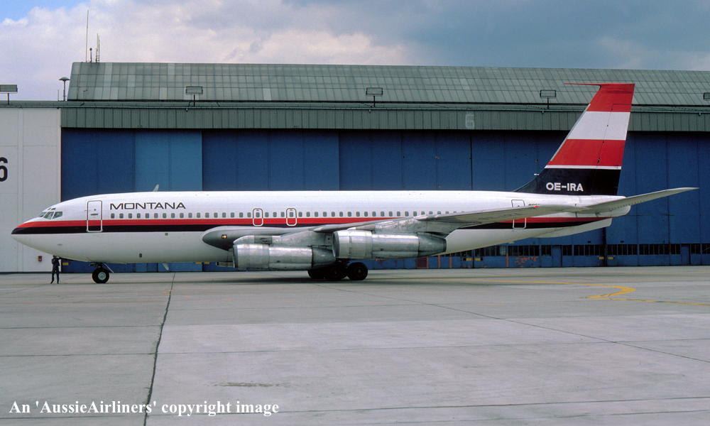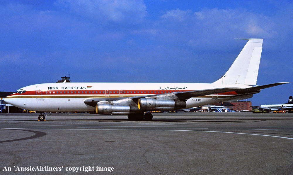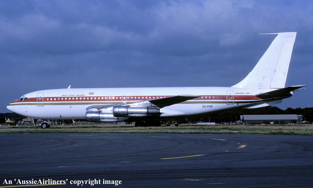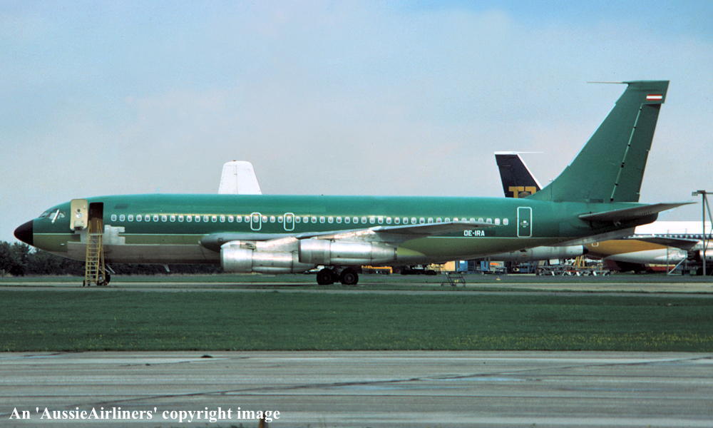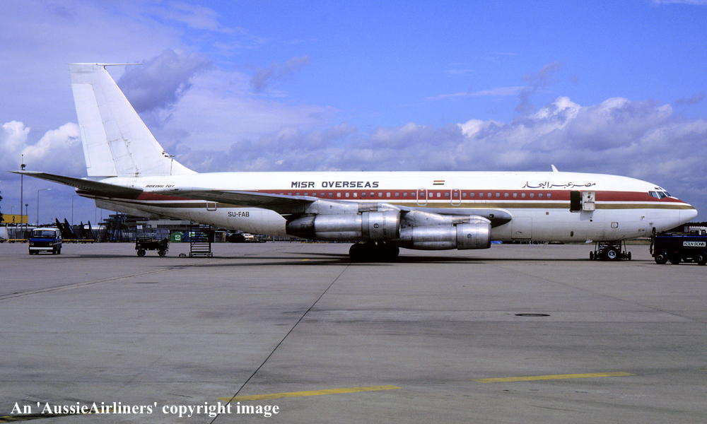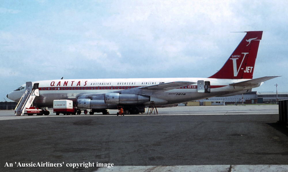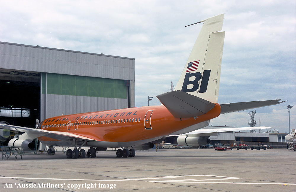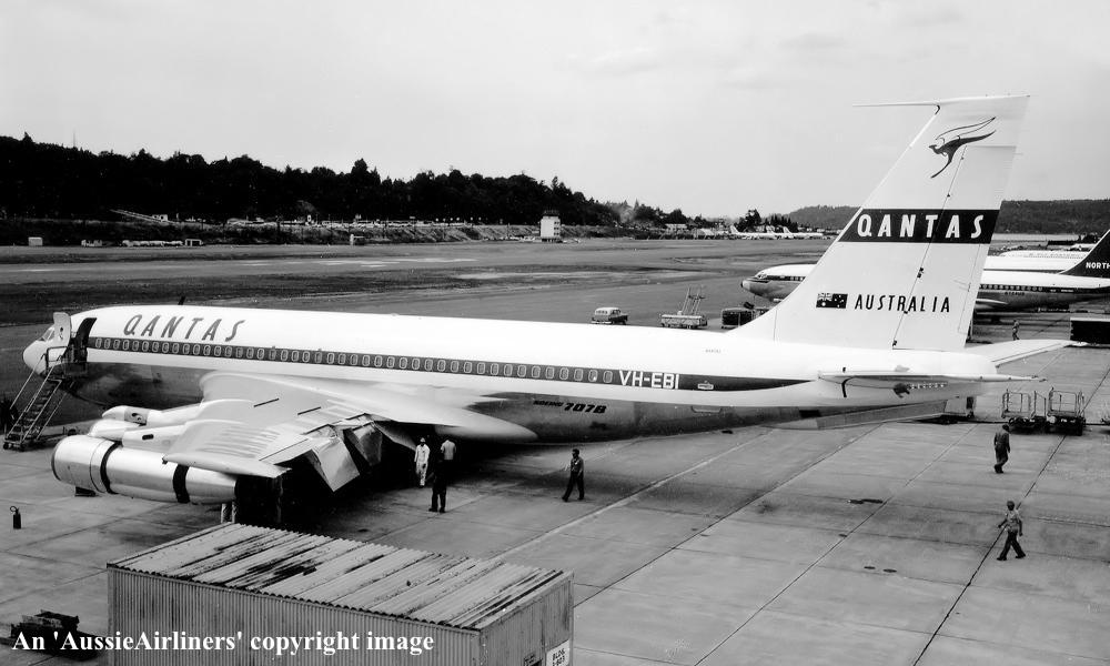 VH-EBI. Boeing 707-138B. c/n 18068-227. Was also registered as: N105BN; OE-IRA; SU-FAB; N245AC. |