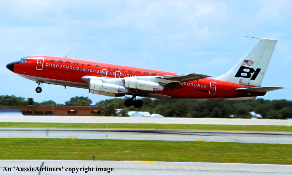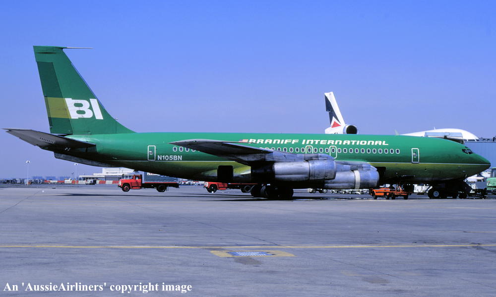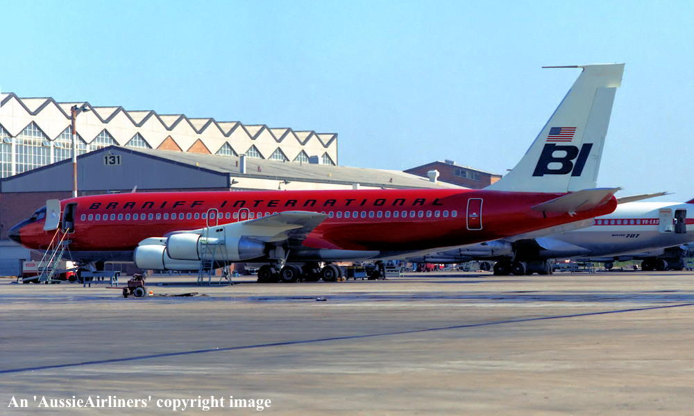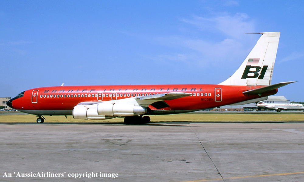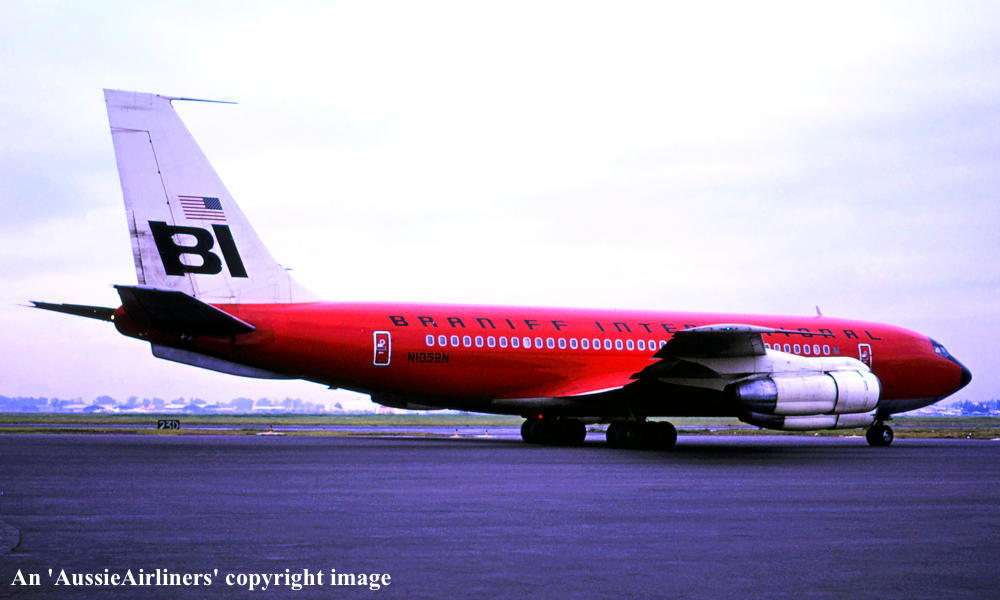 N105BN. Braniff International - in the original livery at Sydney Kingsford Smith Airport, May 1969. (Qantas Heritage Collection Copyright Image 4605-242.) |