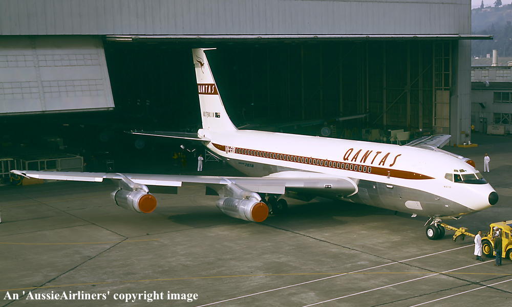 VH-EBI. Qantas Australia - 'Winton' in the experimental or interim livery at Seattle, July 1961. (Qantas Heritage Collection Copyright Image 4605-238.) |