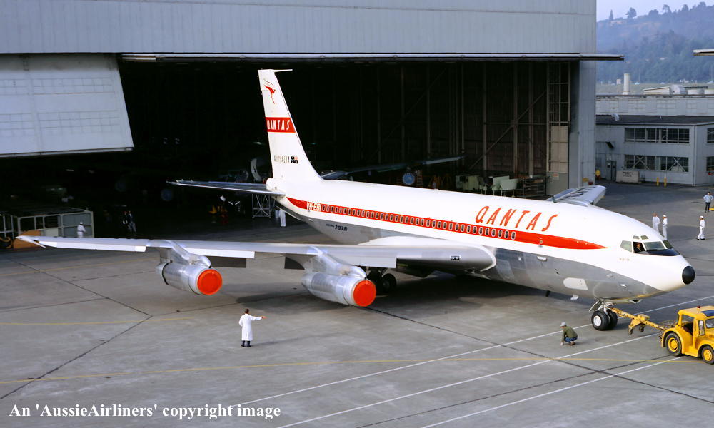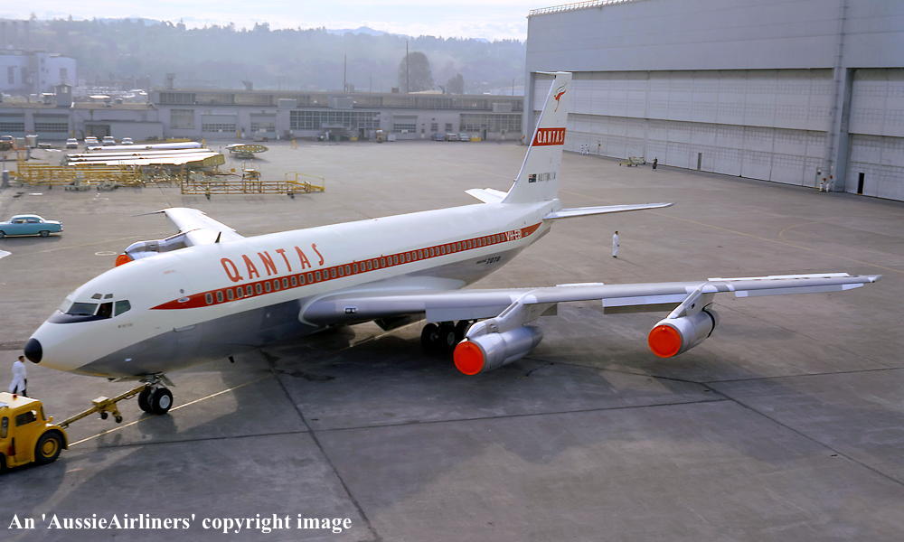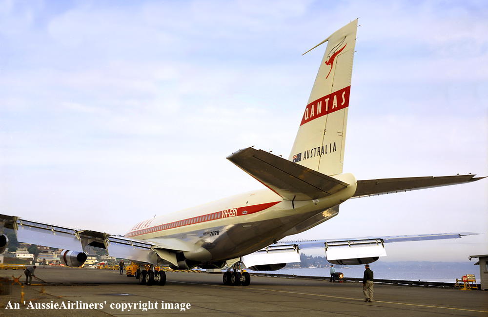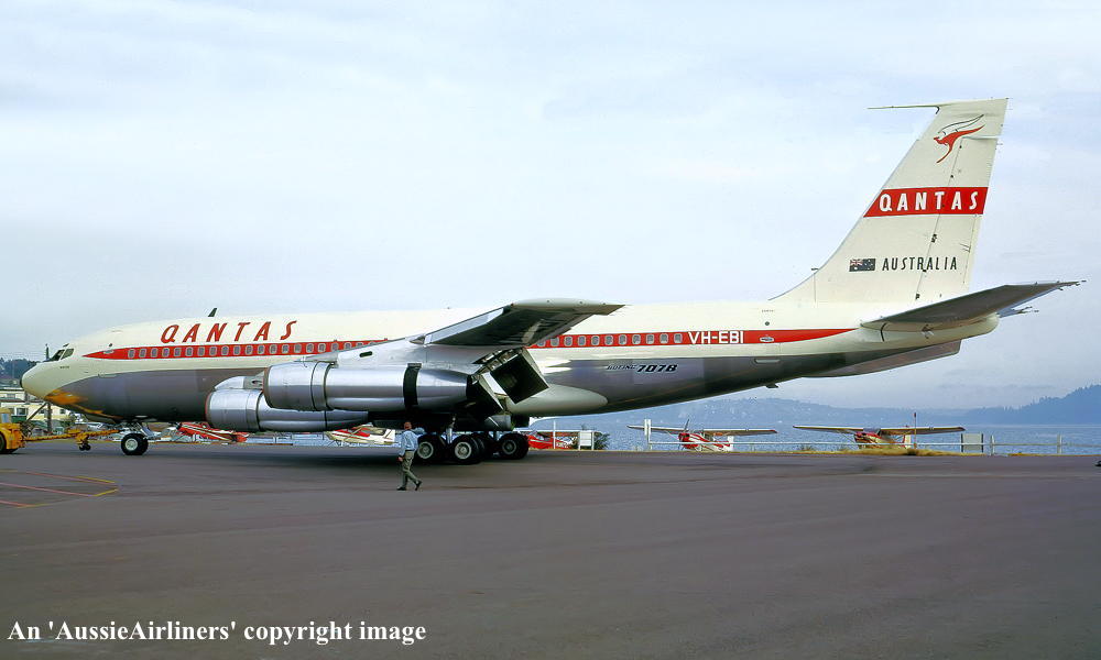 VH-EBI. Qantas Australia - 'Winton' in the experimental or interim livery at Seattle, July 1961. (Qantas Heritage Collection Copyright Image 4604-679.) |