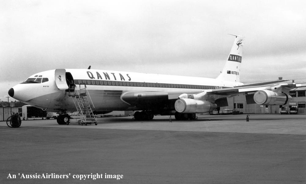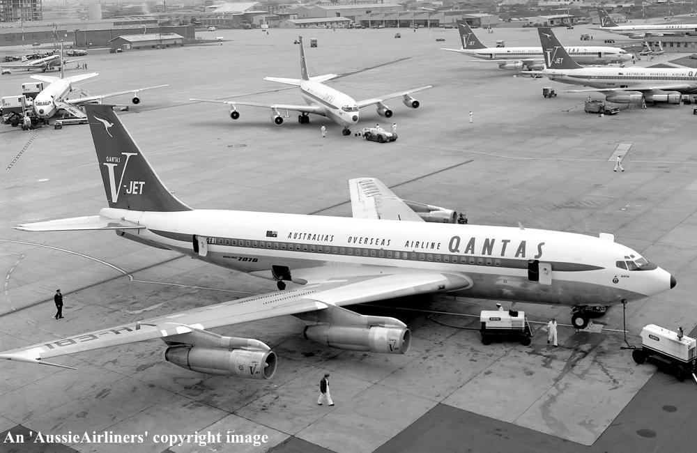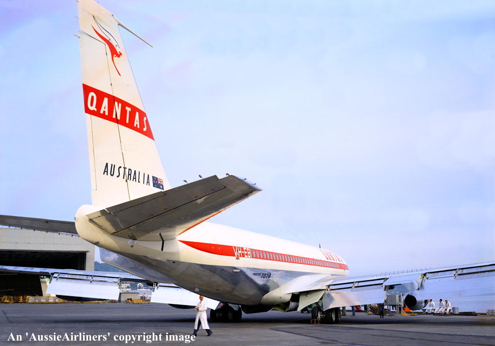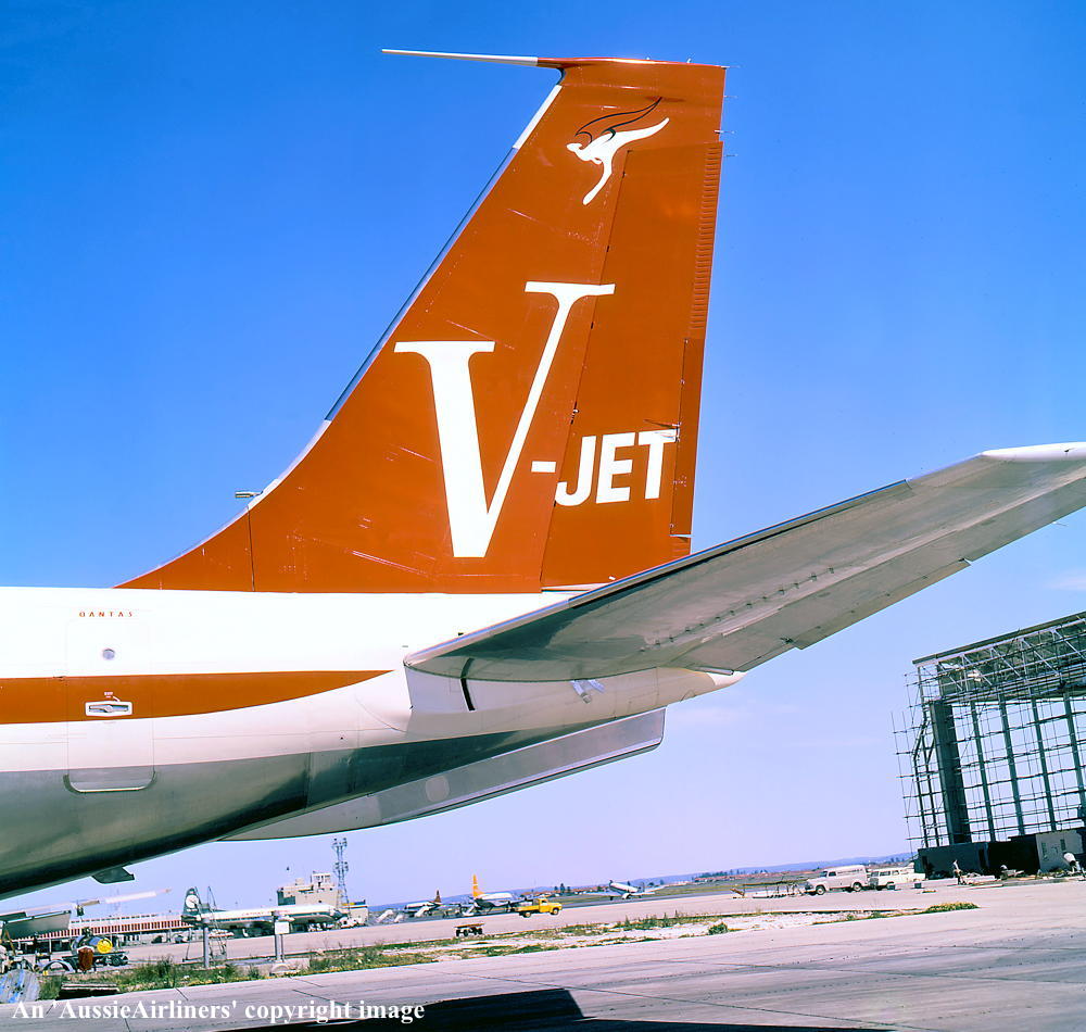 VH-EBI. Qantas Australia's Overseas Airline - 'Winton' in the revised 'V-Jet' livery at Sydney Kingsford Smith Airport, circa 1966. (Qantas Heritage Collection Copyright Image 4605-200.) |