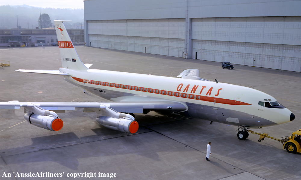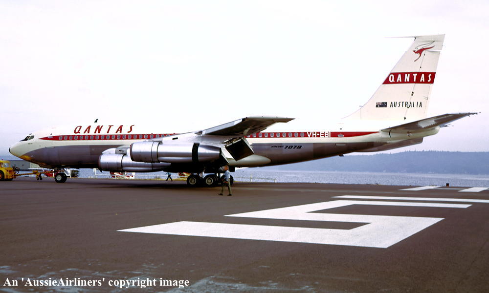 VH-EBI. Qantas Australia - 'Winton' in the experimental or interim livery at Seattle, July 1961. (Qantas Heritage Collection Copyright Image 4604-634.) |