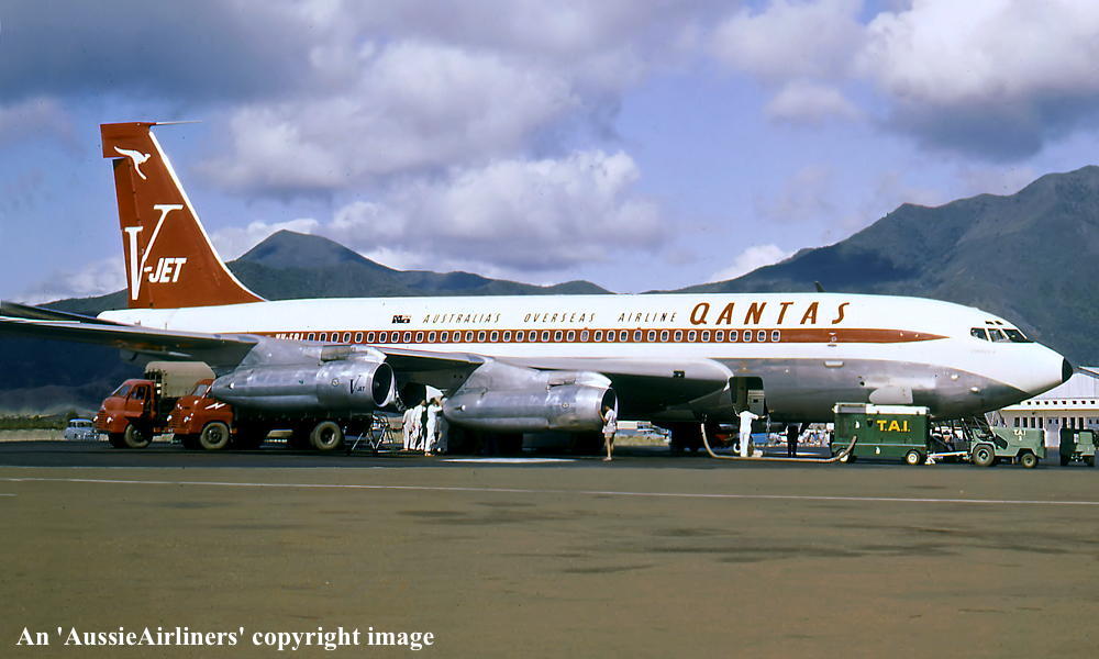 VH-EBI. Qantas Australia's Overseas Airline - 'Winton' in the original 'V-Jet' livery at Noumea Tontouta Airport, date unknown. (Qantas Heritage Collection Copyright Image 4604-758.) |