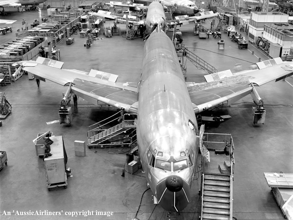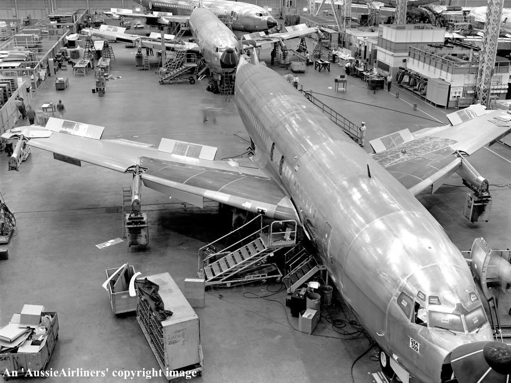 VH-EBI. Qantas Australia - on the production line at the Boeing plant - 1961. (Qantas Heritage Collection Copyright Image 4605-199.) |