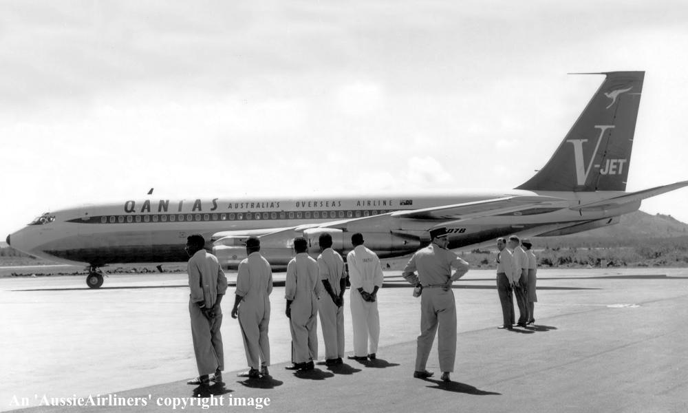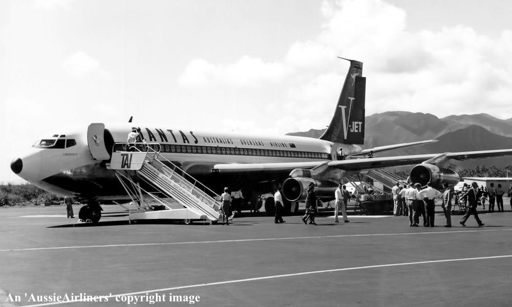 VH-EBJ. Qantas Australia's Overseas Airline - 'Longreach' in the original 'V-Jet' livery at Noumea Airport, December 07, 1961. (Qantas Heritage Collection Copyright Image 4604-808.) |