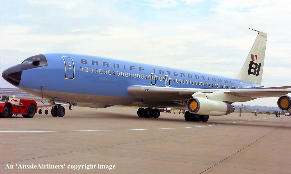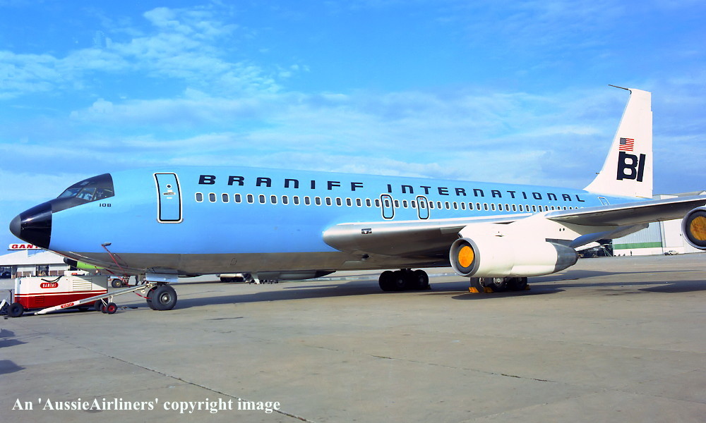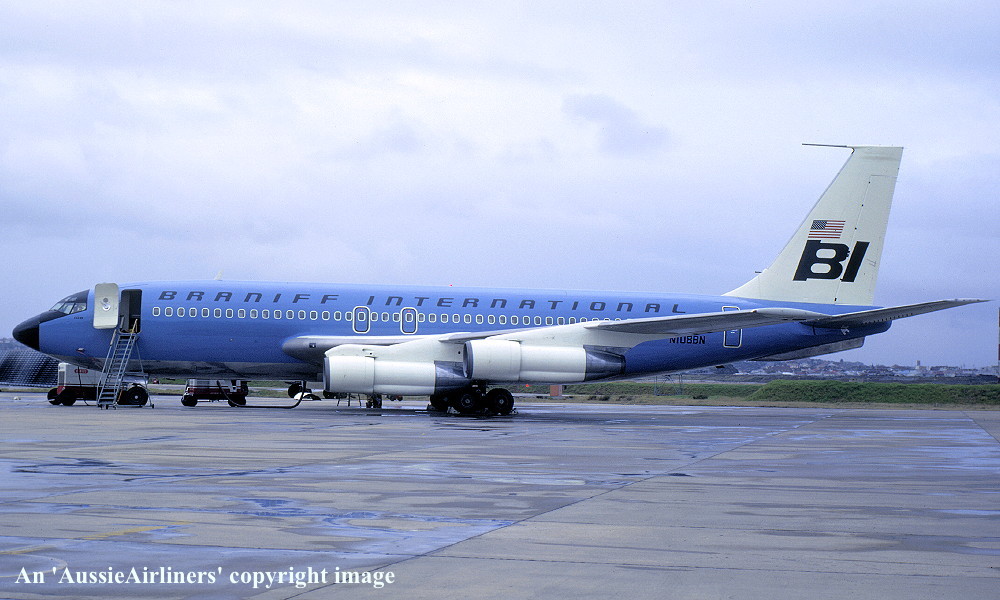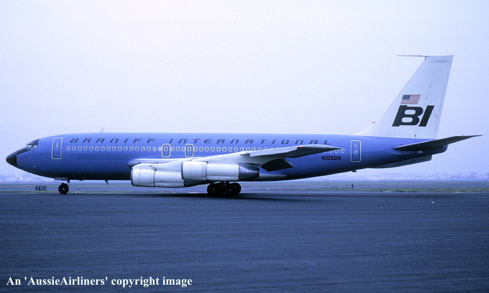 N108BN. Braniff International - in the original livery at Sydney Kingsford Smith Airport, June 1969. (Qantas Heritage Collection Copyright Image 4604-272.) |