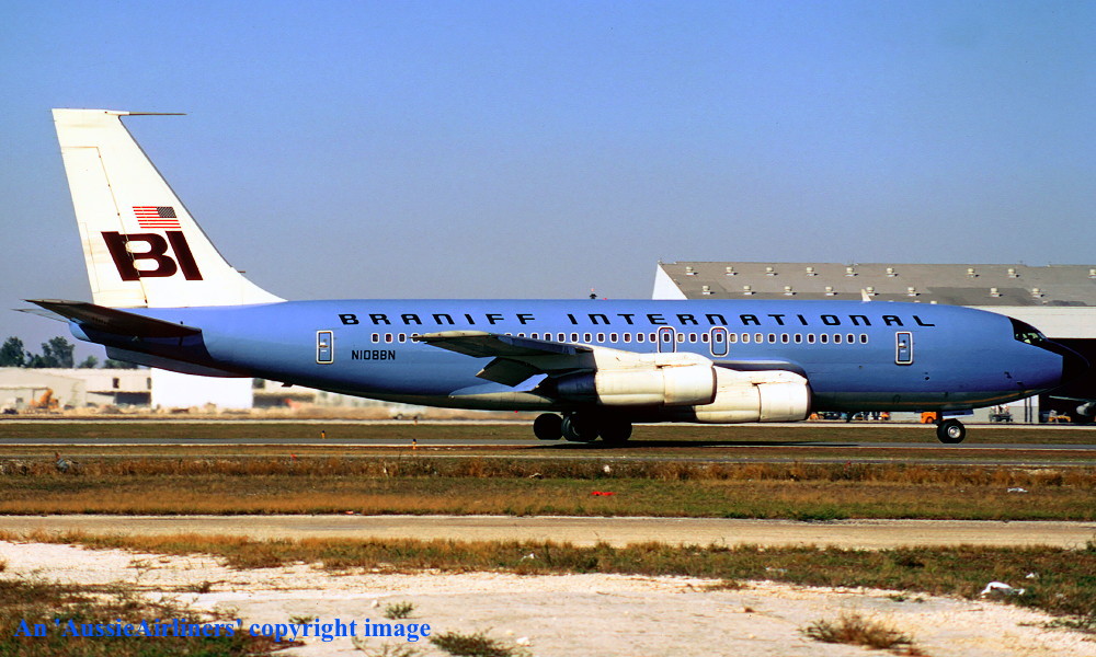 N108BN. Braniff International - in the original livery at an unknown airport, November 1969. (R. N. Smith Collection Copyright Image 4604-317.) |