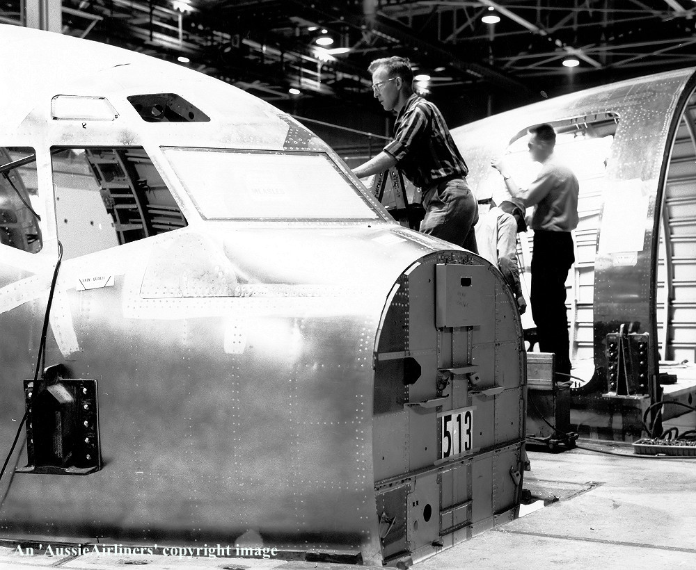 VH-EBM. Qantas Australia's Overseas Airline - the cockpit section in the construction jig at the Boeing plant, circa 1963. (Qantas Heritage Collection Copyright Image 4605-240.) |