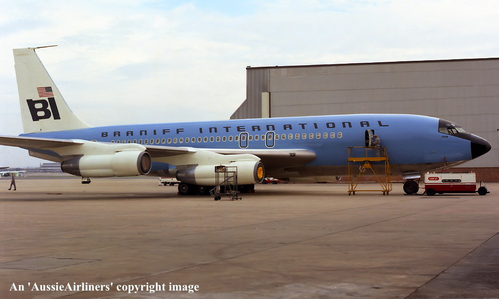 N108BN. Braniff International - in the original livery at Sydney Kingsford Smith Airport, May 1969. (Qantas Heritage Collection Copyright Image 4605-246.) |