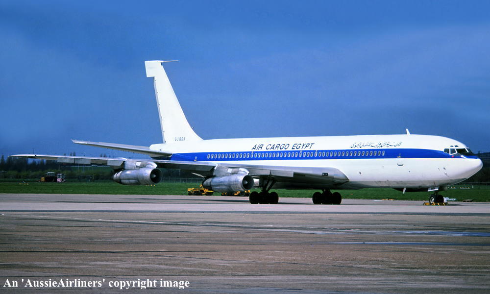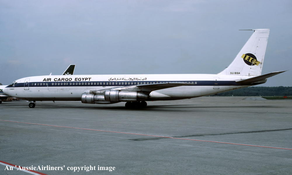 SU-BBA. Air Cargo Egypt - in the standard livery at an unknown airport, April 1980. (R. N. Smith Collection Copyright Image 4604-435.) |