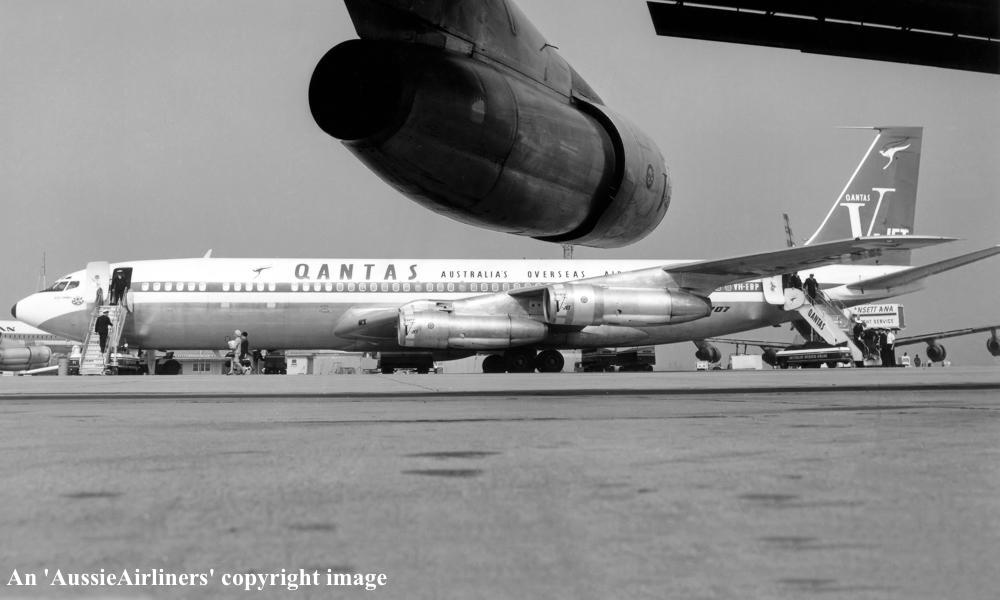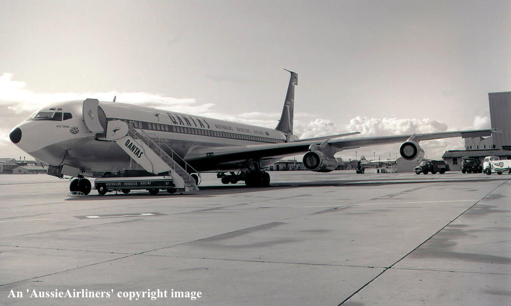 VH-EBP. Qantas Australia - 'Alice Springs' in the 'V-Jet' livery at an unknown airport, April 1968. (R. N. Smith Collection Copyright Image 4604-303.) |