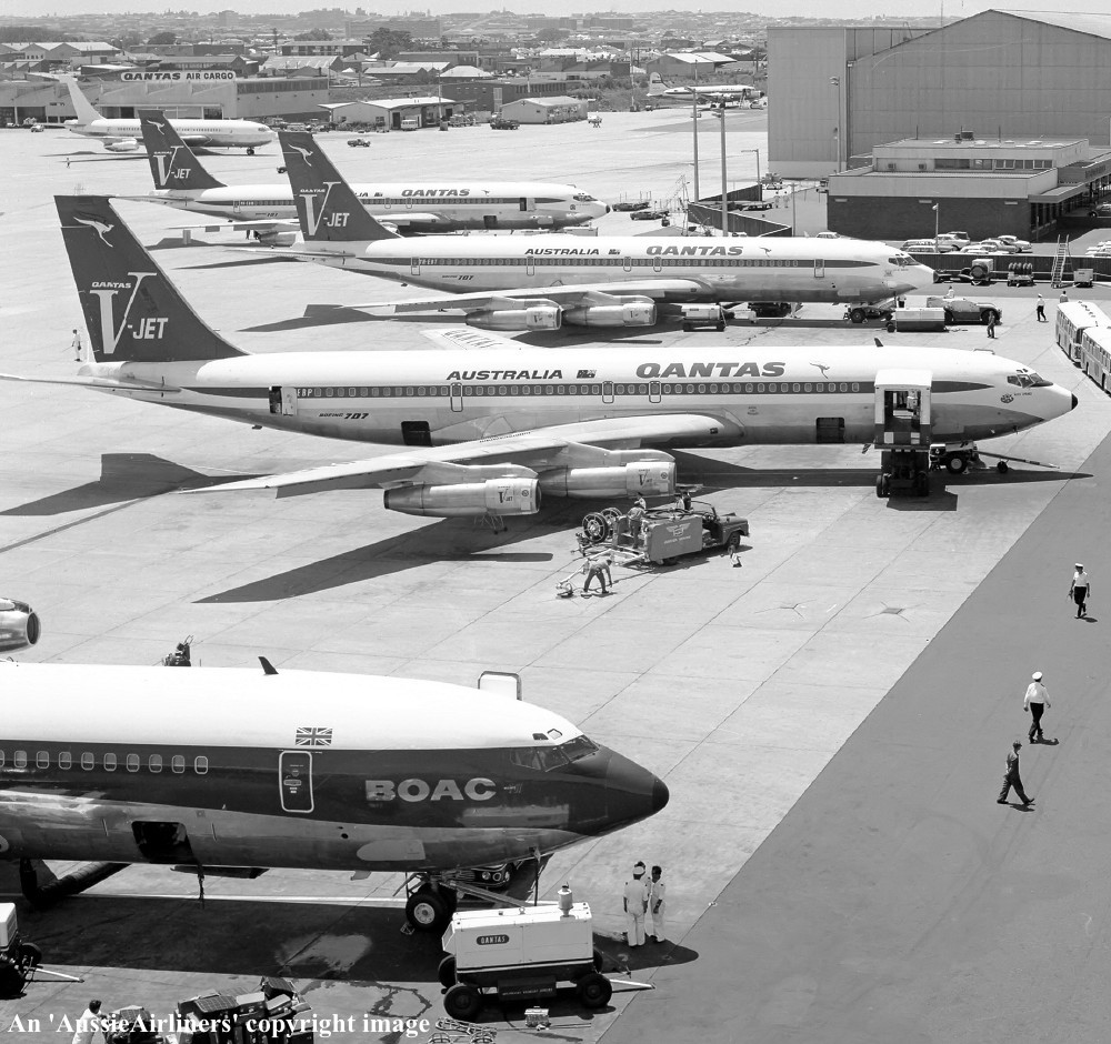 VH-EBP. Qantas Australia's Overseas Airline - 'Alice Springs' in the 'V-Jet' livery at Sydney Kingsford Smith Airport, circa 1966. (Qantas Heritage Collection Copyright Image 4605-153.) |