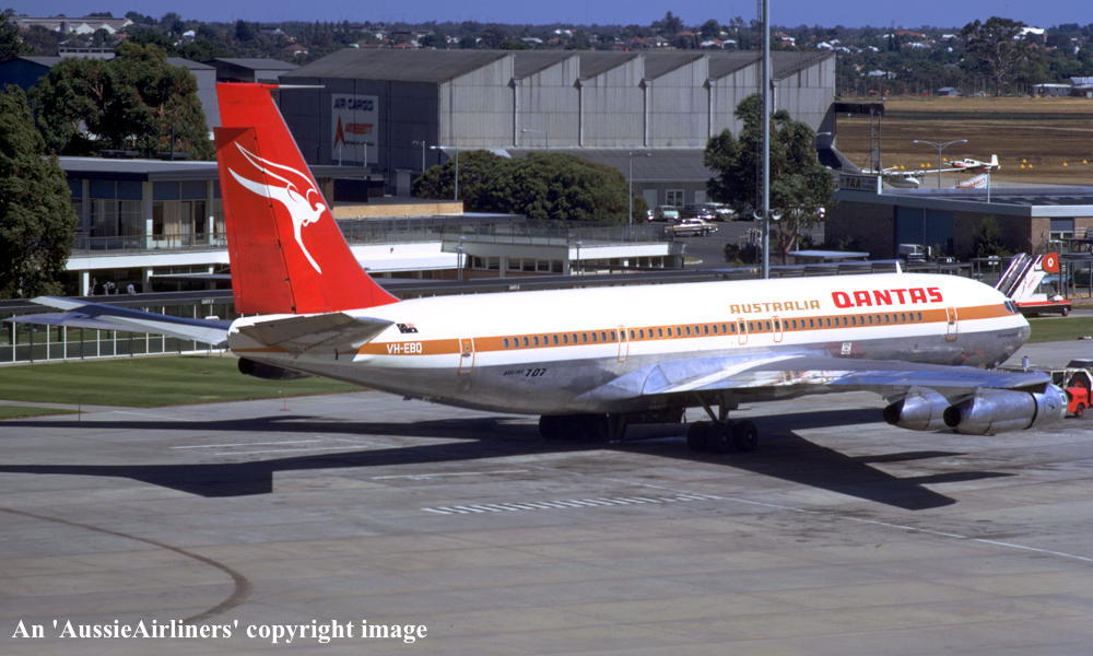 VH-EBQ. Qantas Australia - 'City of Ballarat' in the 'ochre' livery at Perth Airport, December 1973. (G. Bennett Collection Copyright Image 4604-374.) |