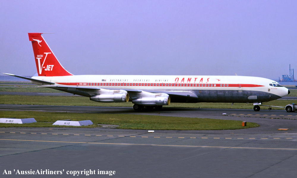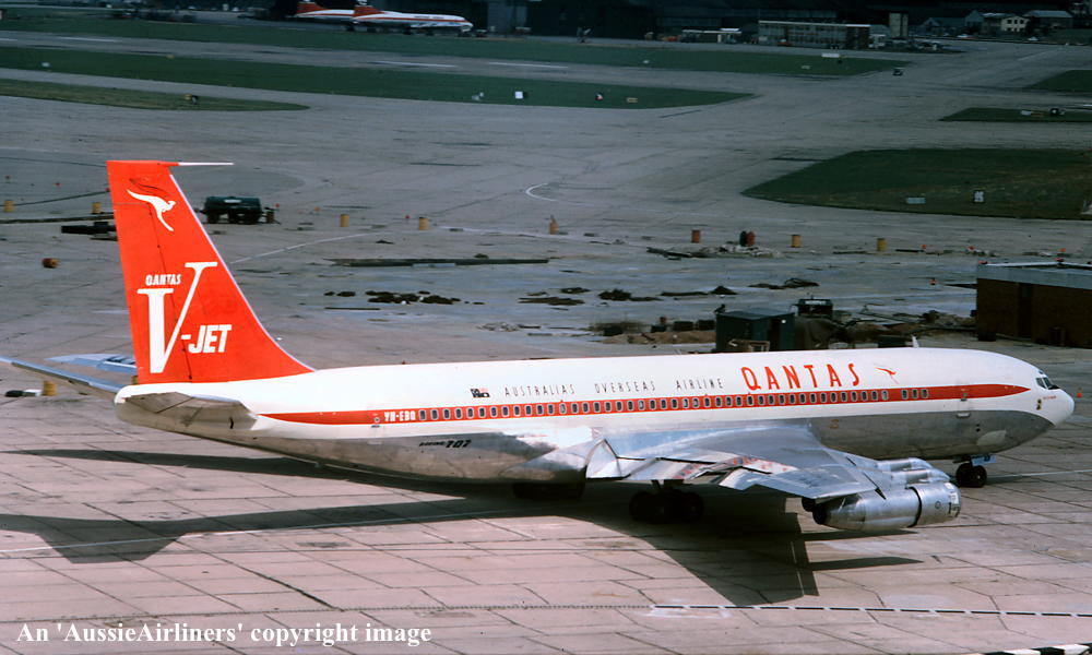 VH-EBQ. Qantas Australia's Overseas Airline - 'City of Ballarat' in the final 'V-Jet' livery at London Gatwick Airport, August 1966. (R. N. Smith Collection Copyright Image 4604-444.) |