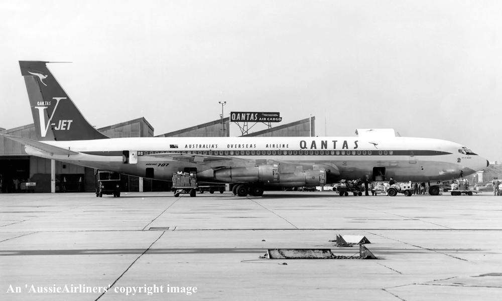 VH-EBQ. Qantas Australia's Overseas Airline - 'City of Ballarat' in the final 'V-Jet' livery at Sydney Kingsford Smith Airport, circa 1966. (Qantas Heritage Collection Copyright Image 4605-166.) |