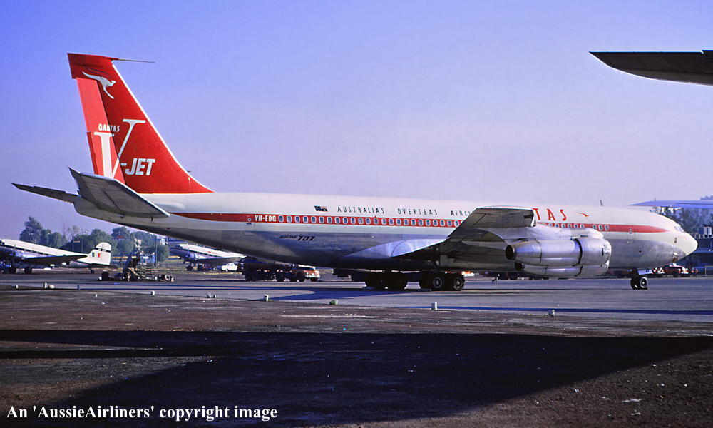 VH-EBQ. Qantas Australia's Overseas Airline - 'City of Ballarat' in the final 'V-Jet' livery at Mexico City Airport, June 1968. (R. N. Smith Collection Copyright Image 4605-316.) |