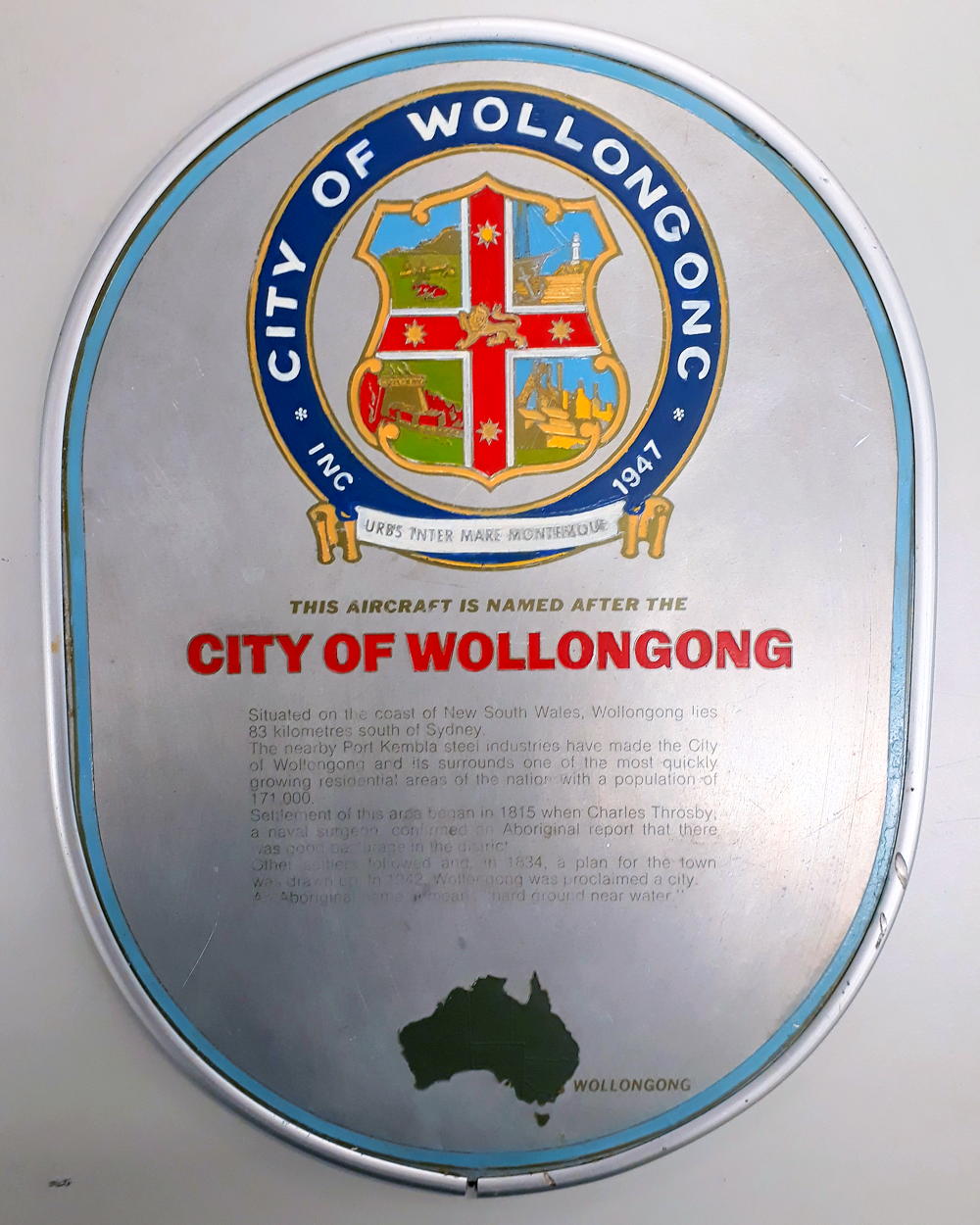 The 'City of Wollongong ' information plaque - as afixed to the bulkhead near the cabin entrance door. (Qantas Heritage Collection Copyright Image 1950-670.) |
