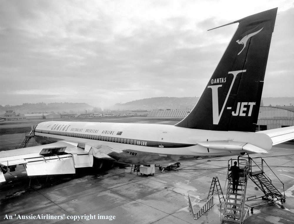 VH-EBR. Qantas Australia's Overseas Airline - 'City of Wollongong' in the 'V-Jet' livery at Seattle Airport, December 1965. (Qantas Heritage Collection Copyright Image 4605-205.) |