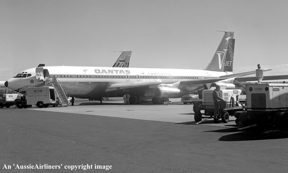 VH-EBR. Qantas Australia - 'City of Wollongong' in the revised 'V-Jet' livery at Sydney Kingsford Smith Airport, December 10, 1968. (R. N. Smith Copyright Image 4605-462.) |