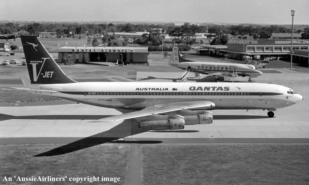 VH-EBS. Qantas Australia - 'Kalgoorlie' in the revised 'V-Jet' livery at Sydney Kingsford Smith Airport, June 1969. (R. N. Smith Copyright Image 4604-422.) |