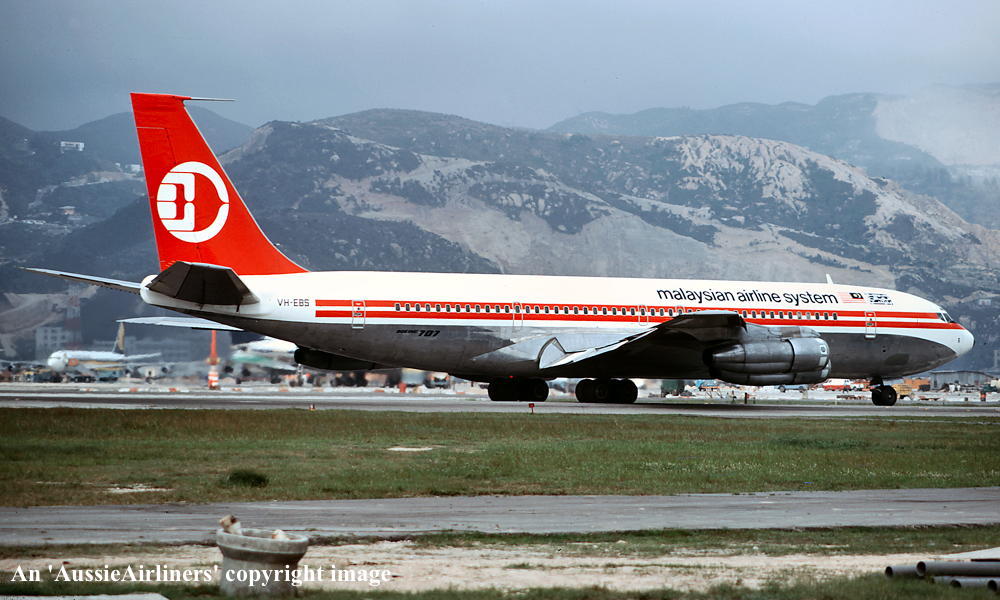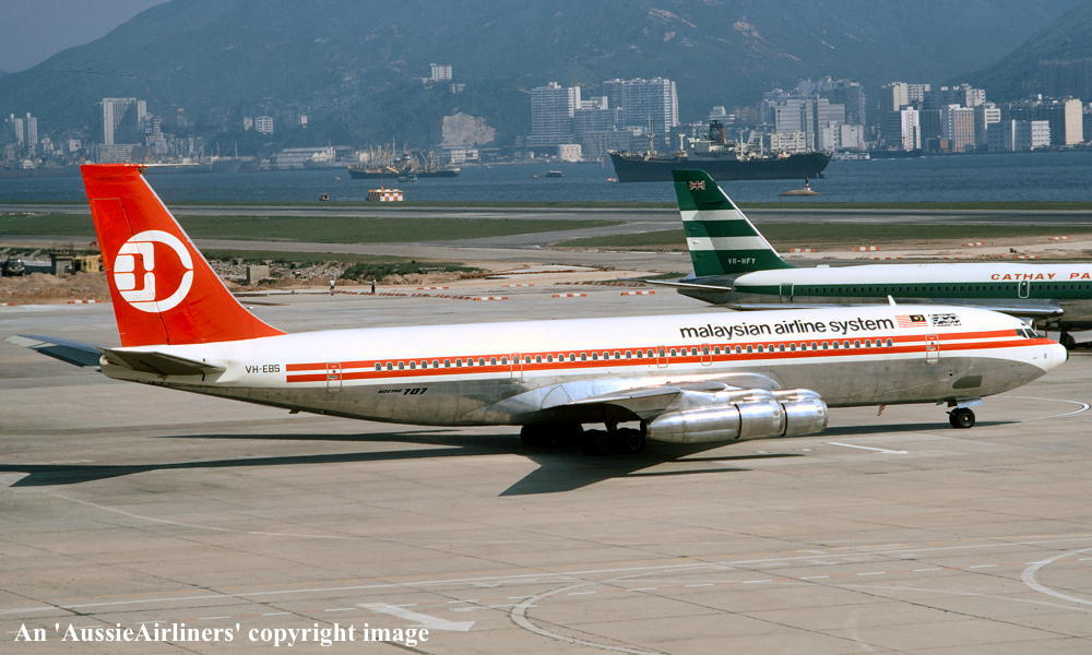 VH-EBS. Malaysian Airline System - in the original livery at Hong Kong Kai Tak Airport, May 1973. (R. N. Smith Collection Copyright Image 4604-403.) |