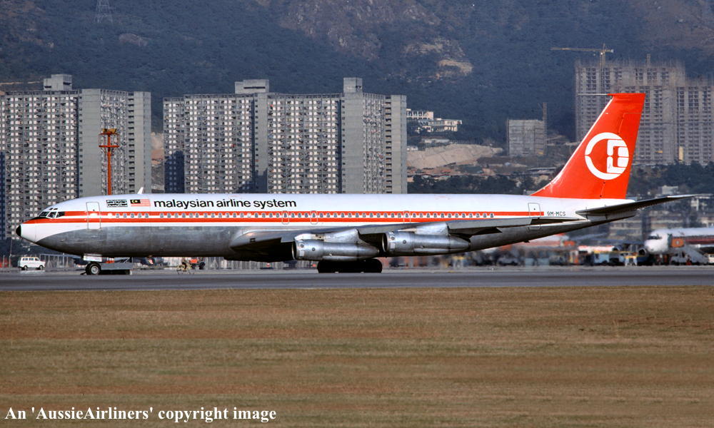9M-MCS. Malaysian Airline System - in the original livery at Hong Kong Kai Tak Airport, December 1977. (R. N. Smith Collection Copyright Image 4604-567.) |