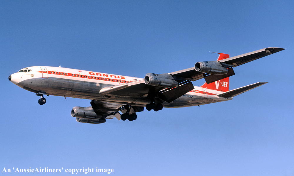 VH-EBS. Qantas Australia - 'Kalgoorlie' in the revised 'V-Jet' livery at Melbourne Tullamarine Airport, June 1970. (R. N. Smith Collection Copyright Image 4604-421.) |