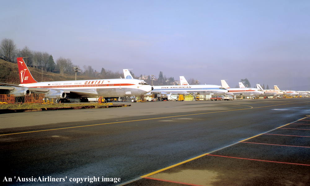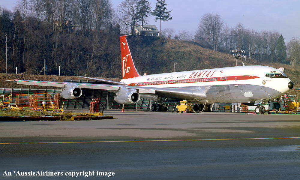 VH-EBS. Qantas Australia's Overseas Airline - 'Kalgoorlie' in the 'V-Jet' livery at Seattle, February 1966. (Qantas Heritage Collection Copyright Image 4605-203.) |
