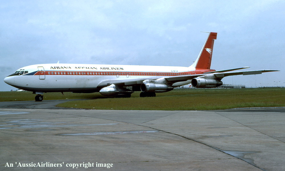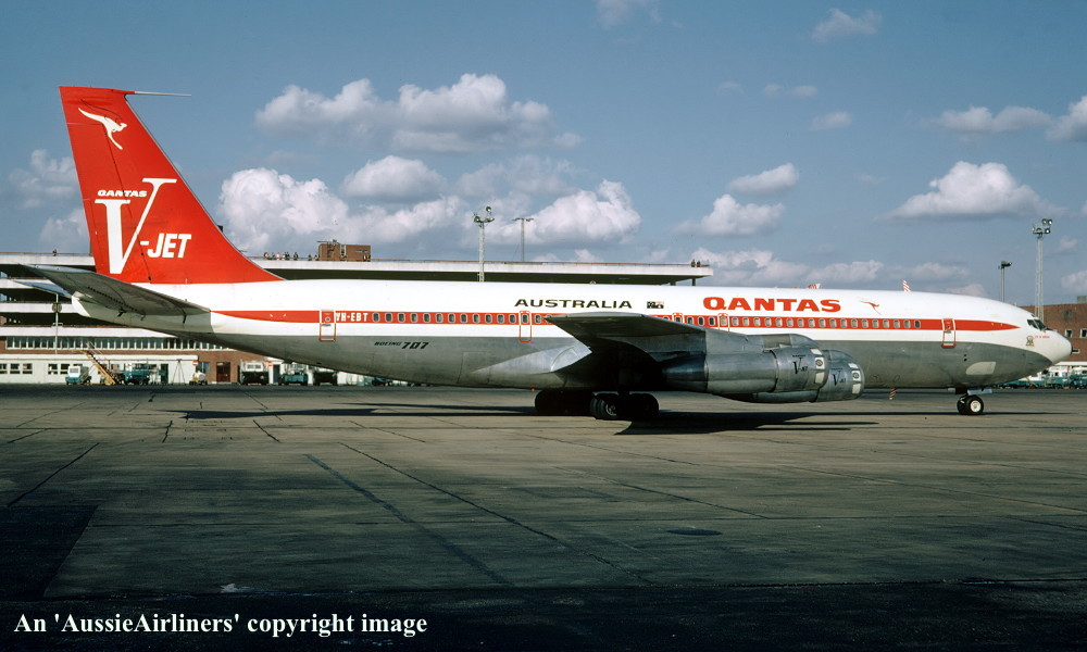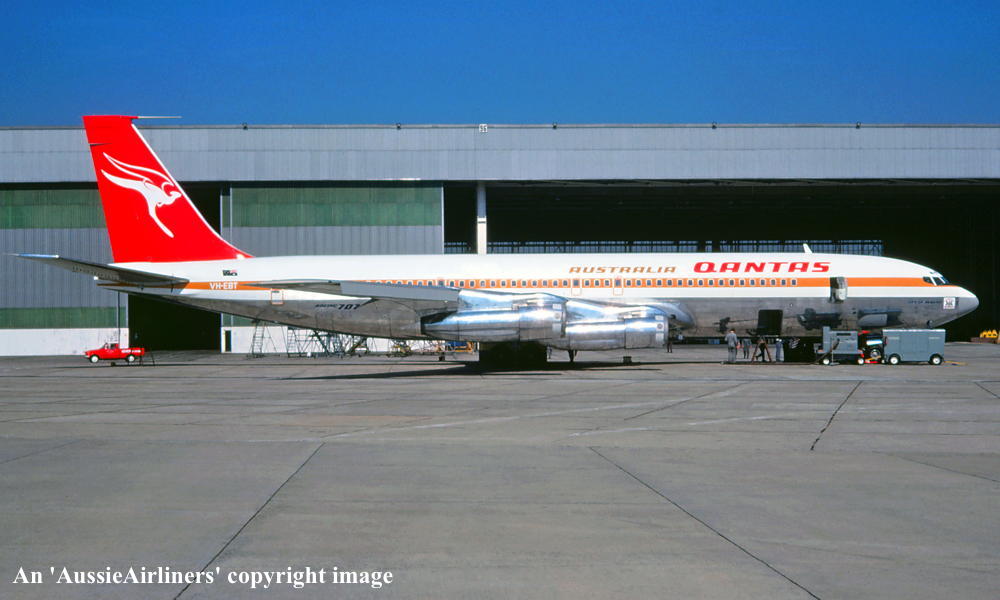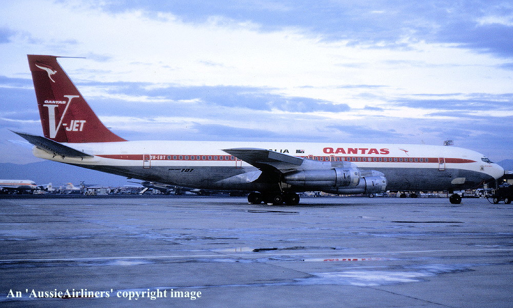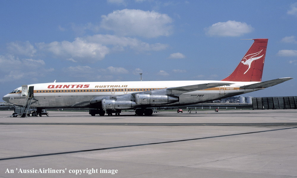 VH-EBT. Boeing 707-338C. c/n 19293-546. Was also registered as: G-BFLE; N861BX; AF94-0284. |