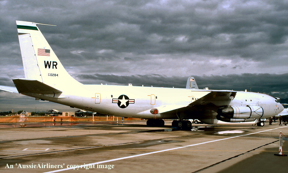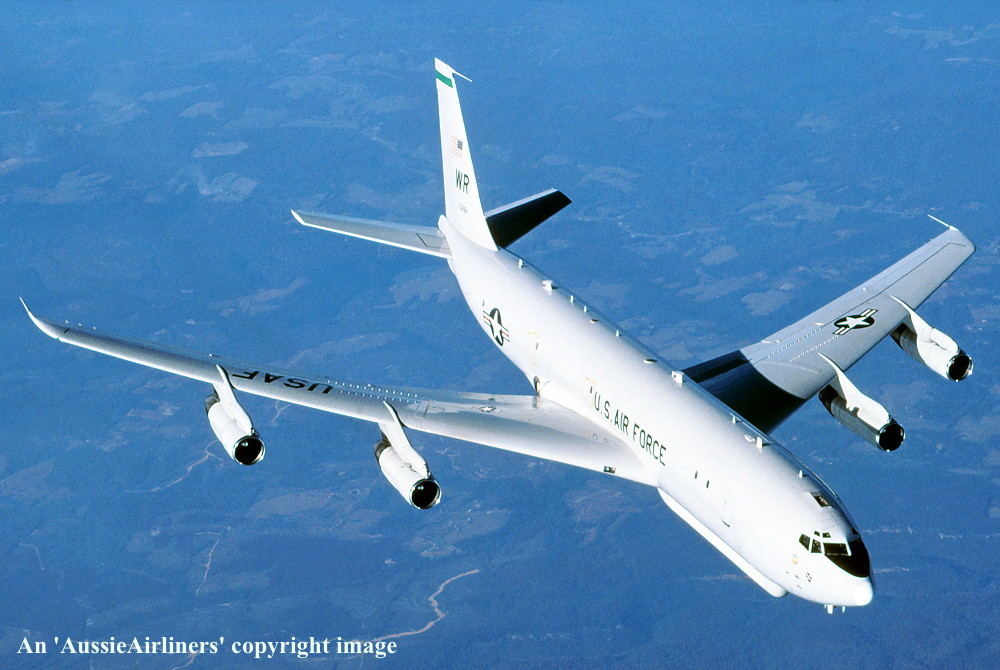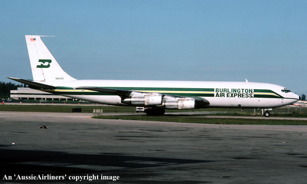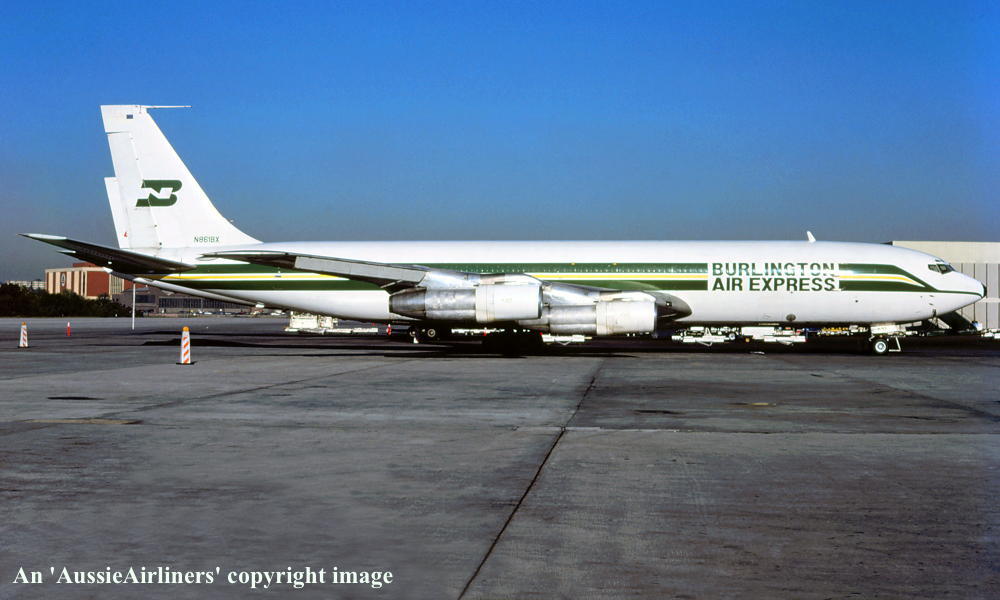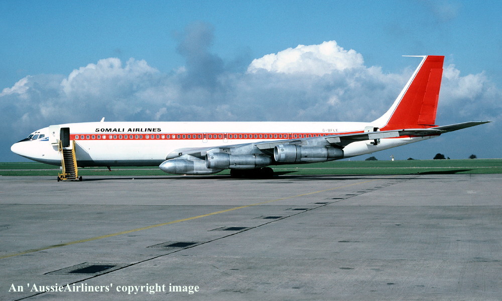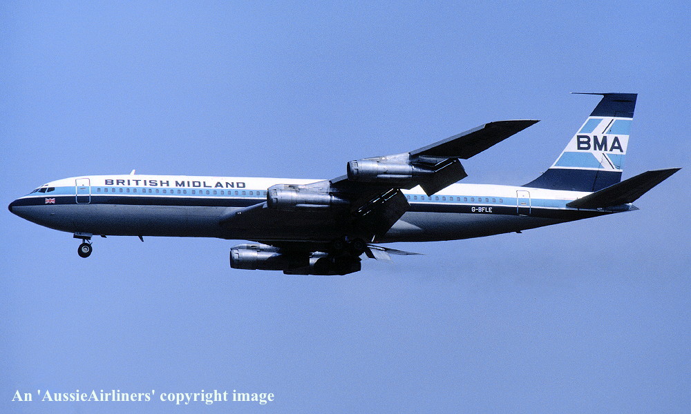 This aircraft was ordered new by Qantas Airways - ? Rolled off the Boeing production line at Seattle (Renton) - November 21, 1966 First flown at Seattle (Renton) as VH-EBT - December 29, 1966 Entered onto the Australian Aircraft Register as VH-EBT - January 27, 1967 Registered to Qantas Empire Airways Ltd, Sydney The aircraft was named 'City of Bendigo' Accepted by M. Mansill for Qantas Airways at Seattle - February 24, 1967 This was the 20th Boeing airliner delivered new to Qantas Airways It was the 20th Boeing 707 delivered to Qantas Departed Seattle (Boeing Field) on delivery flight to Australia (Captain A. Stapleton) - February 26, 1967 It arrived at Sydney (Kingsford Smith - 11:17 local) on completion of the delivery flight - February 28, 1967 Delivery route: Seattle - Honolulu - Nadi - Sydney Operated its first revenue service (freighter) Sydney (Kingsford Smith) - Noumea - March 17, 1967 Departed Sydney (08:28 local) on the first scheduled flight into Melbourne (Tullamarine) - July 01, 1970 It was the first scheduled departure from Melbourne (17:01 local) - San Francisco as QF530 - July 01, 1970 Flew Cyclone Tracey relief flight from Darwin carrying 246 passengers - December 29, 1974 Operated its final revenue service Sydney - Hong Kong - Sydney (Captain Street) as QF27/28 - April 14 - 15, 1978 Cancelled from the Australian Aircraft Register - April 17, 1978 The aircraft had flown 37,492 hours 14 minutes with 14,033 cycles including 3,652 touch & go Entered onto the British Aircraft Register as G-BFLE - April 18, 1978 Registered to ITEL Corporation Leased to British Midland Airways Ltd as the registered operator Accepted by ITEL at Sydney (Kingsford Smith) - May 17, 1978 Departed Sydney (Kingsford Smith) in the Kuwait Airways livery and carrying a 5th engine - May 17, 1978 Sub-leased to Kuwait Airways as the registered operator - May 19, 1978 Returned to British Midland on termination of the lease - July 14, 1978 Sub-leased to Pakistan International Airlines as the registered operator - July 15, 1978 It was observed at Amsterdam in the Pakistan International Airlines livery in a freighter configuration - July 15, 1978 Returned to British Midland at the end of the lease - April 01, 1979 Sub-leased to Air Algerie in basic PIA livery with 'Air Algerie' titles as the registered operator - April 19, 1979 Returned to British Midland on termination of the lease - May 1979 Sold to British Midland - September 1979 Leased to Gulf Air and ferried East Midland - Heathrow in the 'Gulf Air' livery - October 31, 1979 Entered Gulf Air service operating four freighter services per week Heathrow - Bahrain - November 01, 1979 Returned to British Midland at the end of the lease - March 30, 1980 Leased to DETA Mozambique Airlines as the registered operator - April 14, 1980 Ferried East Midlands - Rome - Maputo on delivery to 'DETA' - April 18, 1980 It arrived at Hamburg with DETA tail logo and Linhas Aereas Mocambique fuselage titles - September 28, 1980 Ferried Hamburg - East Midlands after maintenance - October 08, 1980 Leased to Linhas Aereas Mocambique - October 1980 Operated the inaugural LAM flight into Paris (Charles de Gualle) - November 03, 1980 Returned to British Midland at the end of the lease - March 30, 1981 Rolled out at East Midlands with 'Ariana Afghan' titles - April 14, 1981 Leased to Ariana Afghan Airlines as the registered operator - April 15, 1981 Returned to British Midland at the end of the lease - May 26, 1981 Leased to the Canadian Canning Company - May 26, 1981 Returned to British Midland at the end of the lease - July 26, 1981 Leased to Somali Airlines as the registered operator - July 26, 1981 Entered service in the basic 'LAM livery' with Somali Airlines titles Returned to British Midland at the end of lthe ease - September 26, 1981 Departed East Midlands for Tel Aviv for overhaul and reconfiguration to 211 passengers - November 28, 1981 Ferried Tel Aviv - London (Heathrow) - East Midlands in the 'British Midland' livery - February 03, 1982 Leased to El Al as the registered operator - March 27, 1982 Returned to British Midland at the end of the lease - May 1982 Leased to Saudi Arabian Airlines for hadj flights - September 1982 Returned to British Midland at the end of the lease - November 1982 Leased to El Al to cover for a pilot's strike - November 1982 Returned to British Midland at the end of the lease - December 1982 Operated its final B.M.A. revenue service Tenerife - Manchester - November 30, 1984 Withdrawn from service and stored at East Midlands - November 30, 1984 The aircraft had flown 50,683 hours with 18,601 cycles Sold by Chemco Leasing to ATASCO and then Radix Air Corp - August 1985 Ferried East Midlands - Tel Aviv for hush-kitting - August 21, 1985 Cancelled from the British Aircraft Register - August 21, 1985 Entered onto the United States Aircraft Register as N861BX - August 21, 1985 Registered to Chemco Leasing Corp Sold by Chemco Leasing to ATASCO Isreal - August 21, 1985 Sold to Radix Corporation - August 21, 1985 Sold to ATASCO Leasing - November 22, 1985 Ferried Tel Aviv - Bangor (U.S.A.) for delivery to Burlington Air Express - December 06, 1985 Leased to Burlington Air Express - January 1986 Sub-leased to Southern Air Transport as the registered operator - January 1986 Sold to Meridan Trust Company, Reading, PA - March 1986 Registered to Meridan Trust Company, Reading, PA - March 1986 Leased to Southern Air Transport as the registered operator Returned to Burlington Air Express at the end of the lease - January 08, 1992 Sub-leased to Buffalo Airways for one day - January 08, 1992 Withdrawn from service and offered for immediate sale - September 08, 1992 The aircraft had flown 58,080 hours with 24,427 cycles to date Sold to AeroUSA - June 04, 1993 Sold to Buffalo Airways - June 04, 1993 Sold to Starflite Corporation - June 02, 1994 Sold to Grumman Aerospace Corp, Florida for Joint-STARS conversion - June 02, 1994 Certification of Registration issued