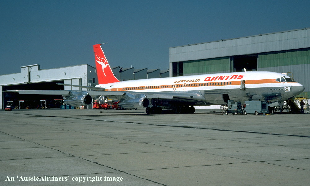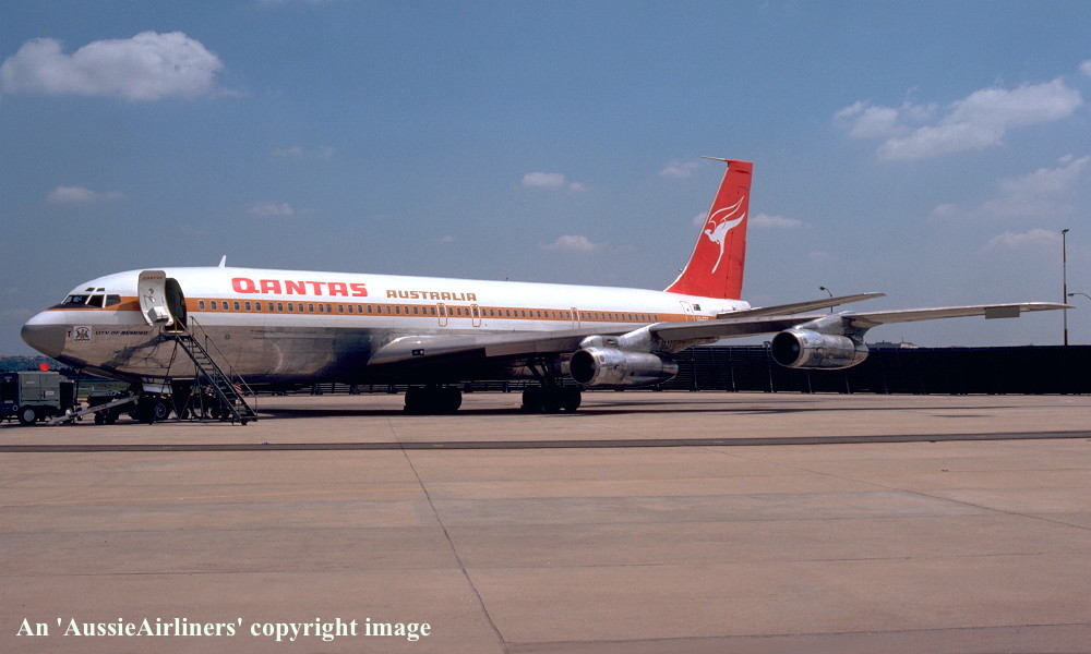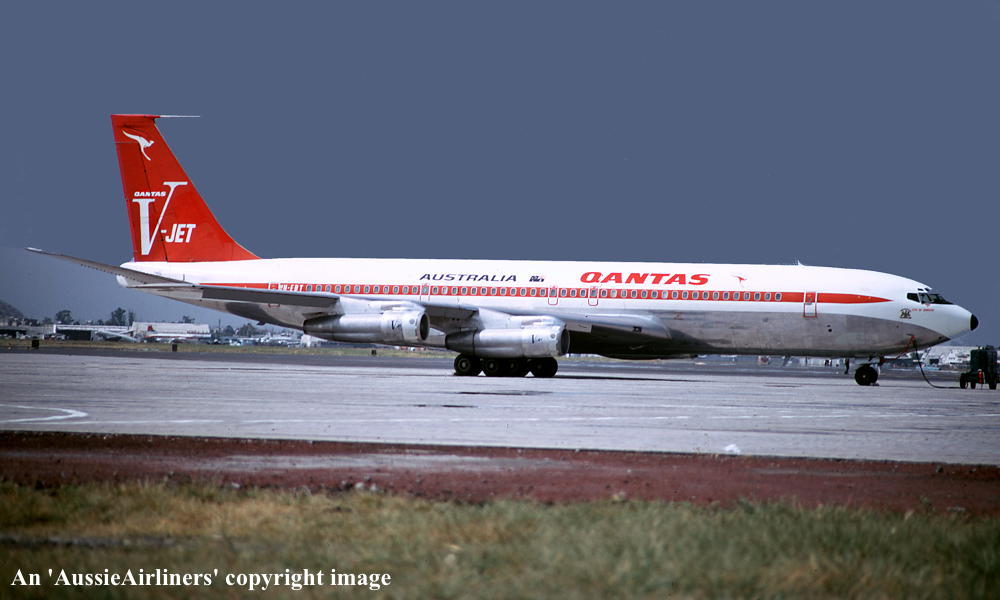 VH-EBT. Qantas Australia - 'City of Bendigo' in the 'V-Jet' livery at Mexico City Airport, October 1968. (R. N. Smith Collection Copyright Image 4604-119.) |