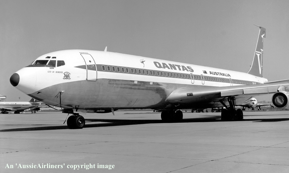 VH-EBT. Qantas Australia - 'City of Bendigo' in the 'V-Jet' livery at London Heathrow Airport, June 1969. (R. N. Smith Collection Copyright Image 4604-618.) |