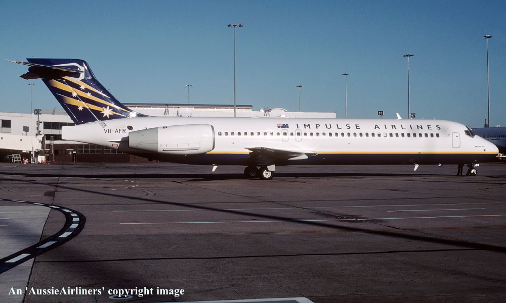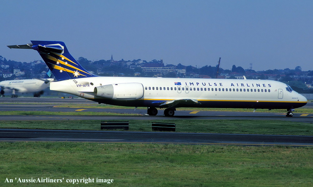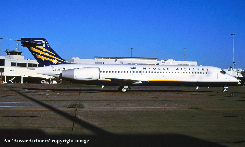 VH-AFR. Impulse Airlines - in the standard livery at Sydney Kingsford Smith Airport, November 2000. (R. N. Smith Collection Copyright Image 4660-080.) |