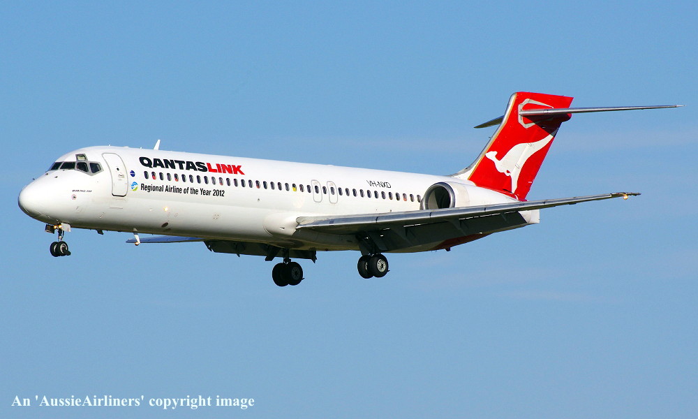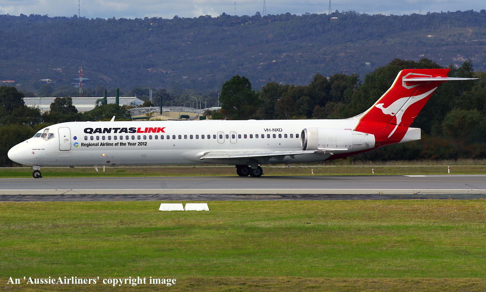 VH-NXD. QantasLink - in the standard livery with additional 'Regional Airline Of The Year 2012' titles at Perth Airport, June 18, 2013. (R. N. Smith Collection Copyright Image 4660-474.) |