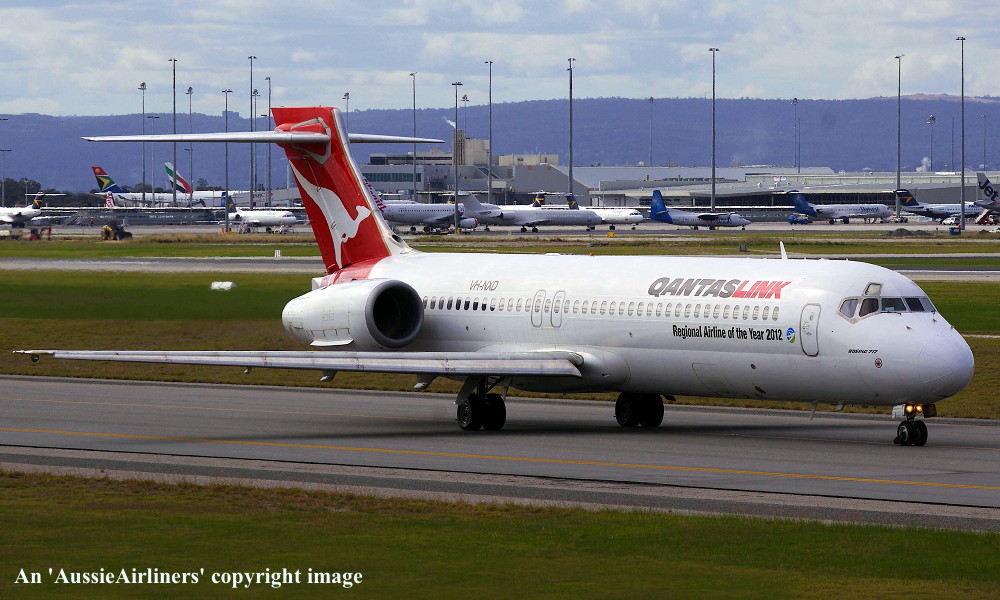 VH-NXD. QantasLink - in the standard livery with additional 'Regional Airline Of The Year 2012' titles at Perth Airport, June 18, 2013. (R. N. Smith Collection Copyright Image 4660-473.) |