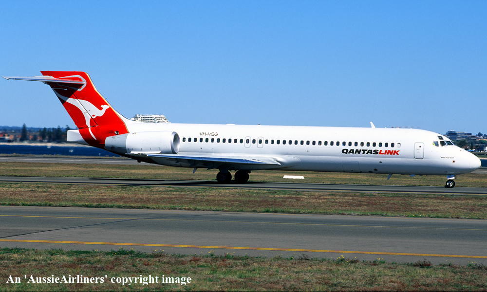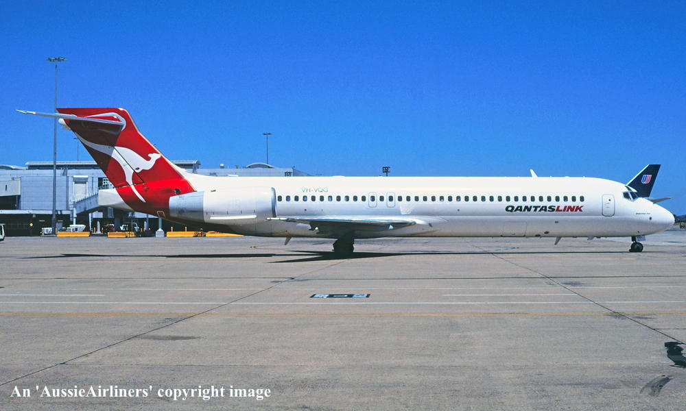 VH-VQG. QantasLink - in the original livery at Sydney Kingsford Smith Airport, July 2002. (R. N. Smith Copyright Image 4660-059.) |
