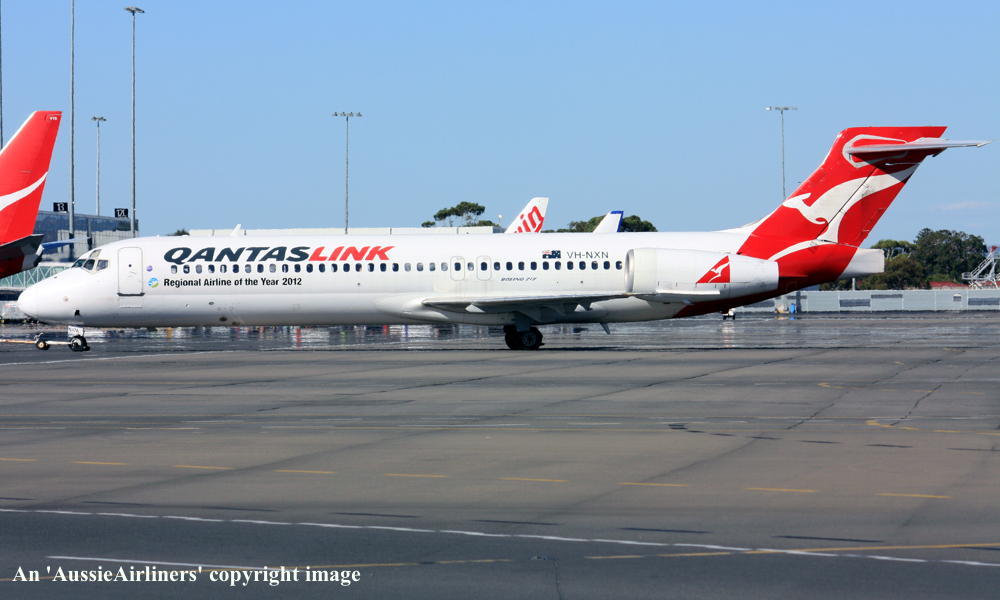 VH-NXN. QantasLink - in the 'New Roo' livery with additional 'Regional Airline of the Year 2012' titles at Perth Airport, March 28, 2013. (M. Lynam Copyright Image 4660-342.) |
