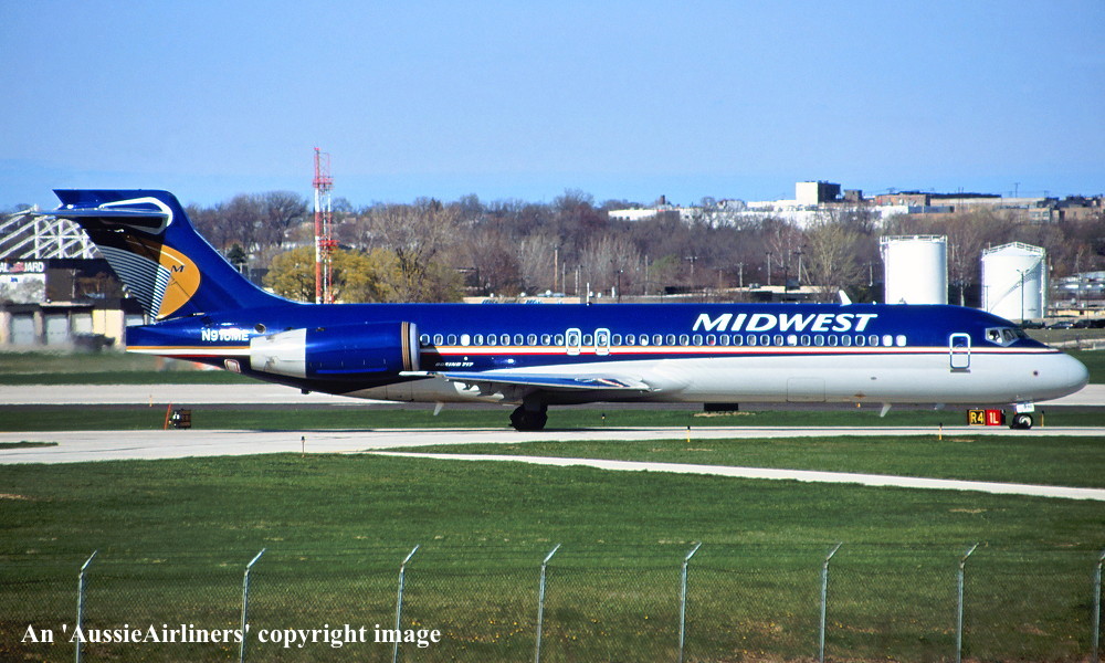 N916ME. Midwest - in the standard livery at an unknown airport, April 2005. (R. N. Smith Collection Copyright Image 4660-403.) |