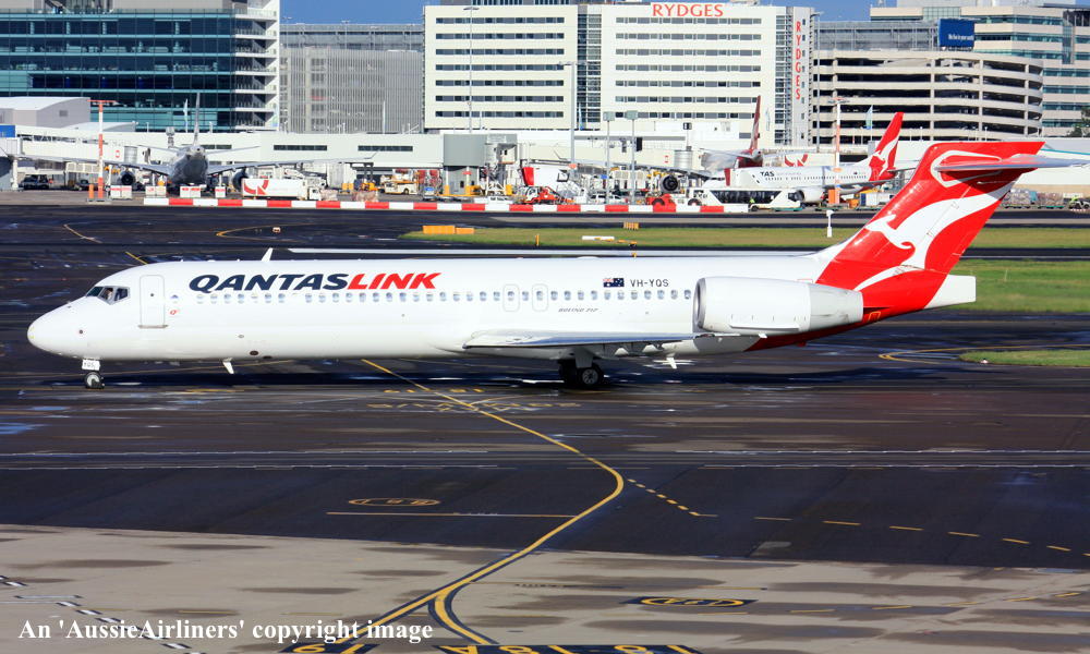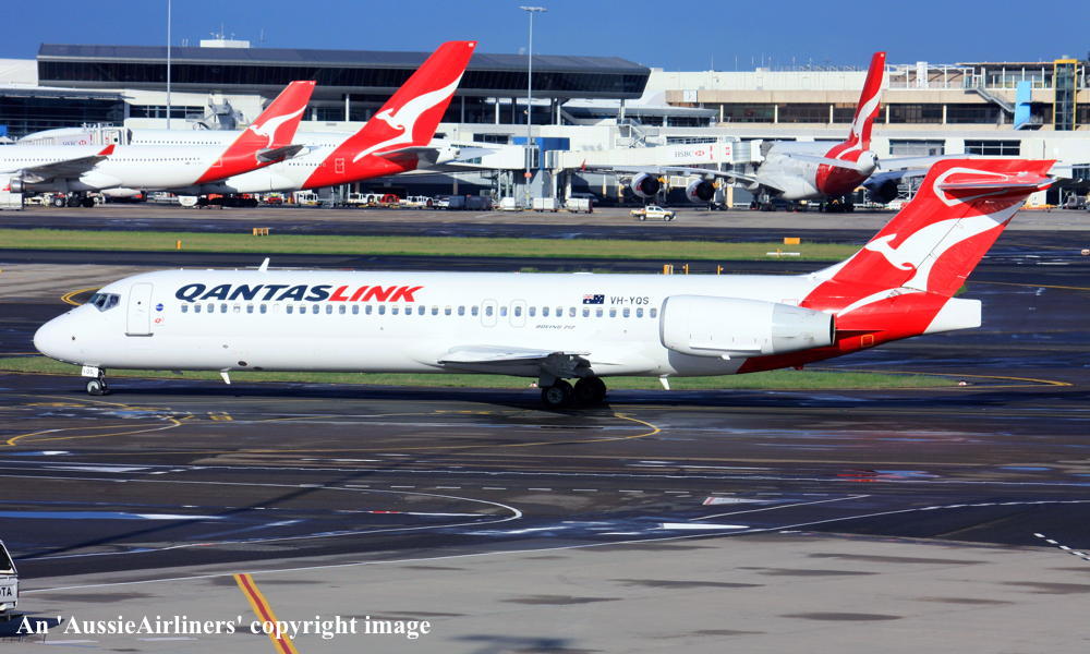 VH-YQS. QantasLink - in the 'New Roo' livery at Sydney Kingsford Smith Airport, March 10, 2014. (T. Haynes Copyright Image 4660-603.) |