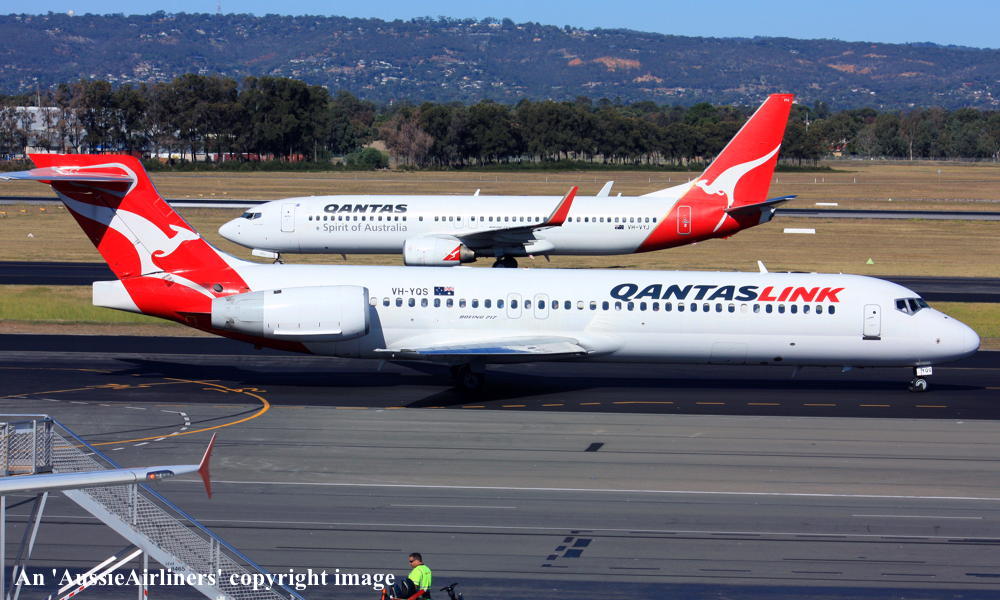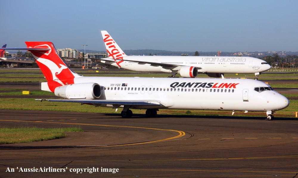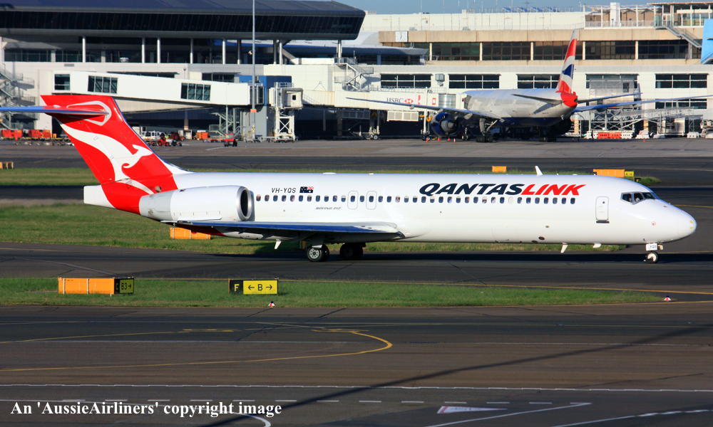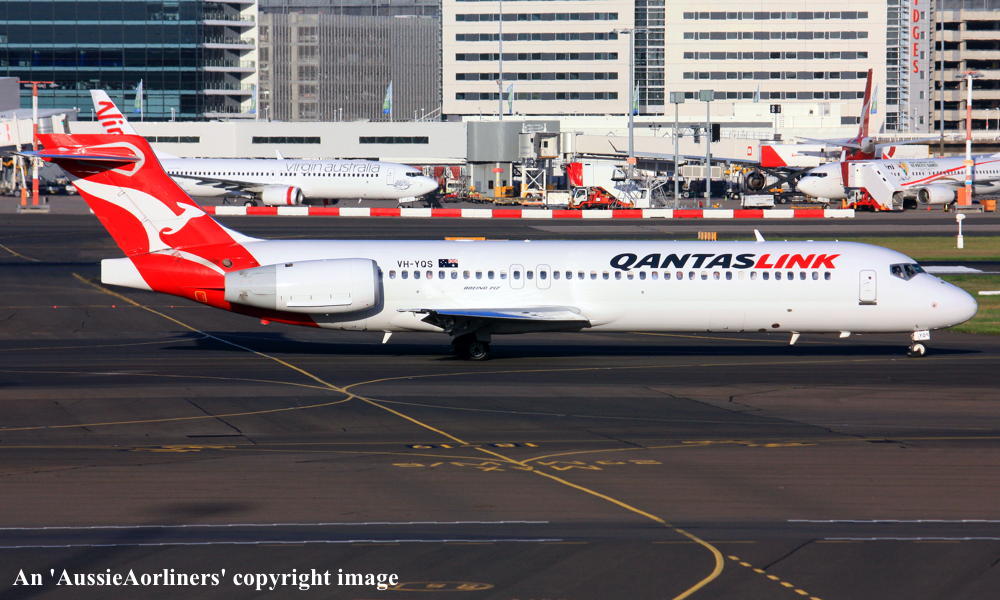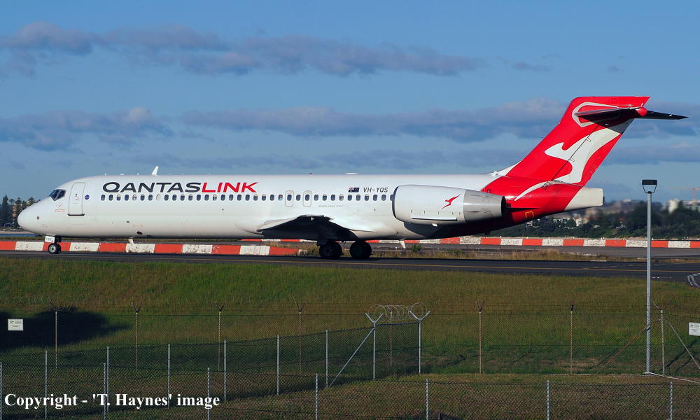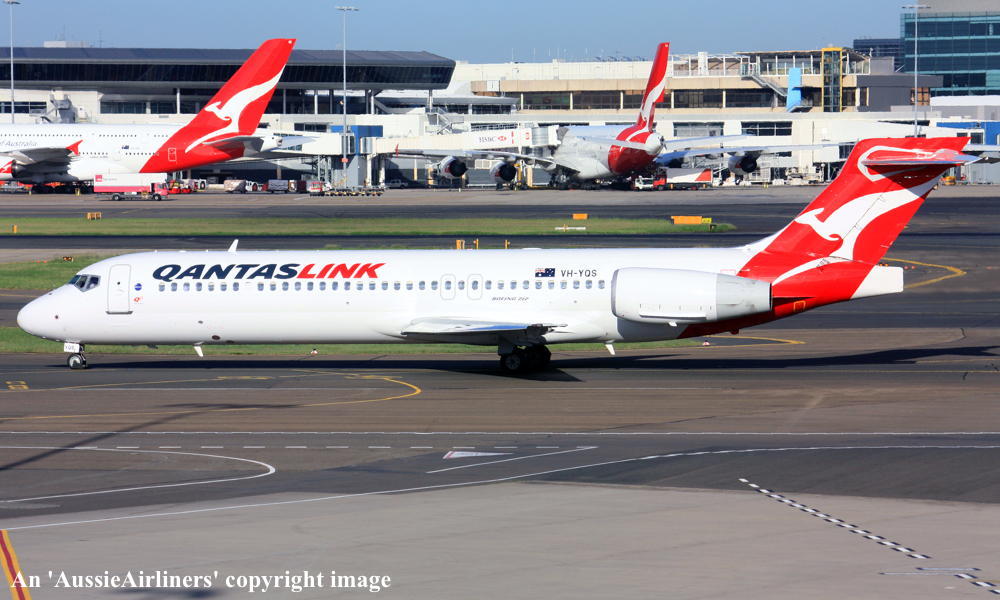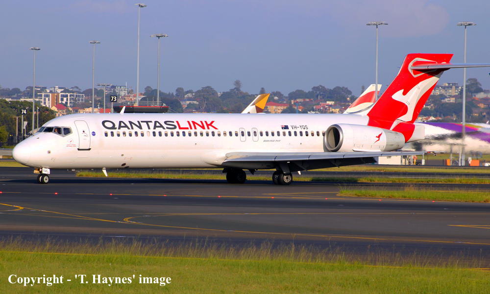 VH-YQS. QantasLink - in the 'New Roo' livery at Sydney Kingsford Smith Airport, March 10, 2014. (T. Haynes Copyright Image 4660-602.) |