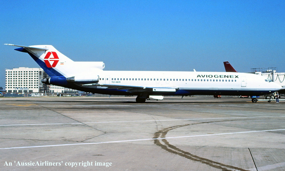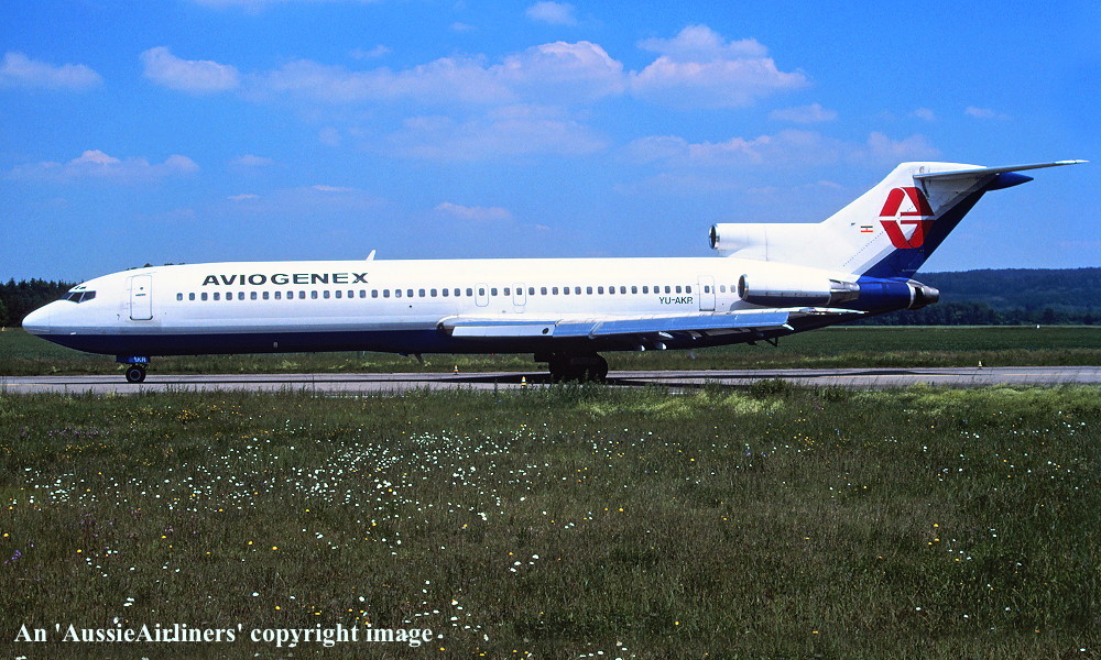 YU-AKR. Aviogenex - in the basic Braniff livery at an unknown airport, May 1990. (R. N. Smith Collection Copyright Image 4610-821.) |