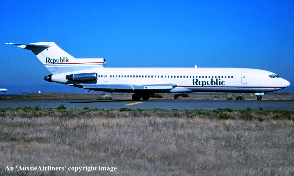 N275WC. Republic - in the interim livery at an unknown airport, November 1985. (R. N. Smith Collection Copyright Image 4610-881.) |