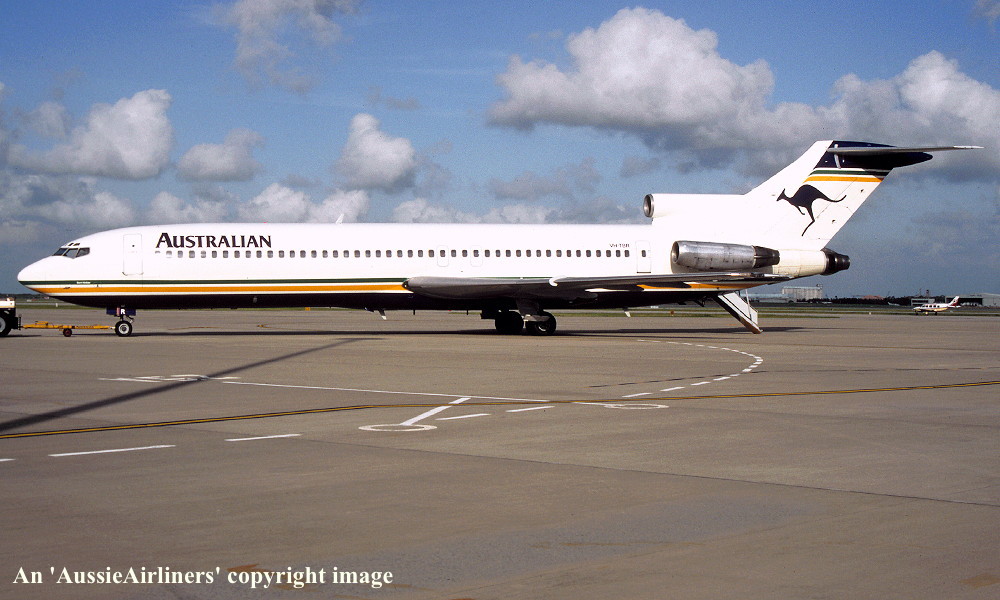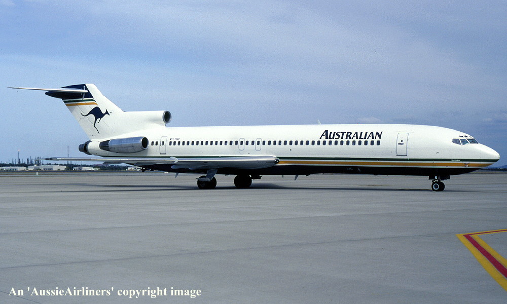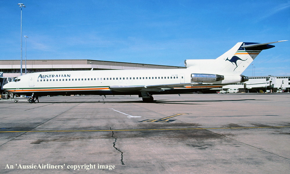 VH-TBR. Australian - in the basic livery at Melbourne Tullamarine Airport, March 20, 1993. (R. N. Smith Collection Copyright Image 4610-382.) |