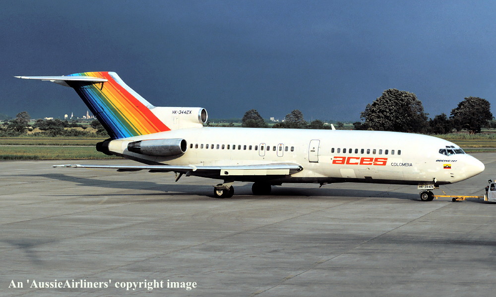 HK-3442X. Aces Colombia - in the basic Trans Brasil livery at Quito Airport, October 1988. (R. N. Smith Collection Copyright Image 4610-177.) |
