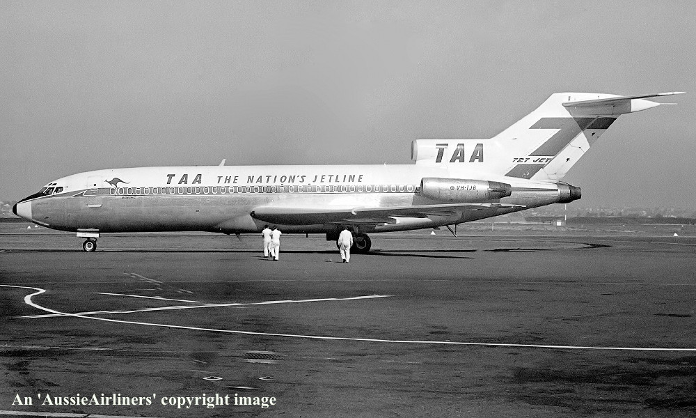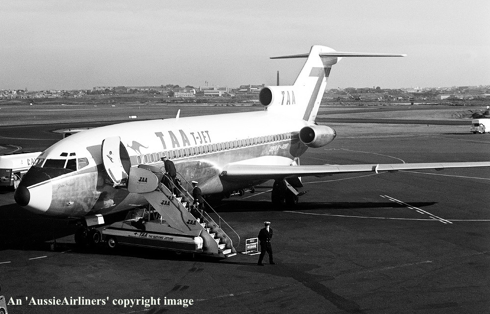 VH-TJB. TAA T-Jet - 'John Forrest' in the standard livery at Sydney Kingsford Smith Airport, September 1968. (R. N. Smith Collection Copyright Image 4610-464.) |