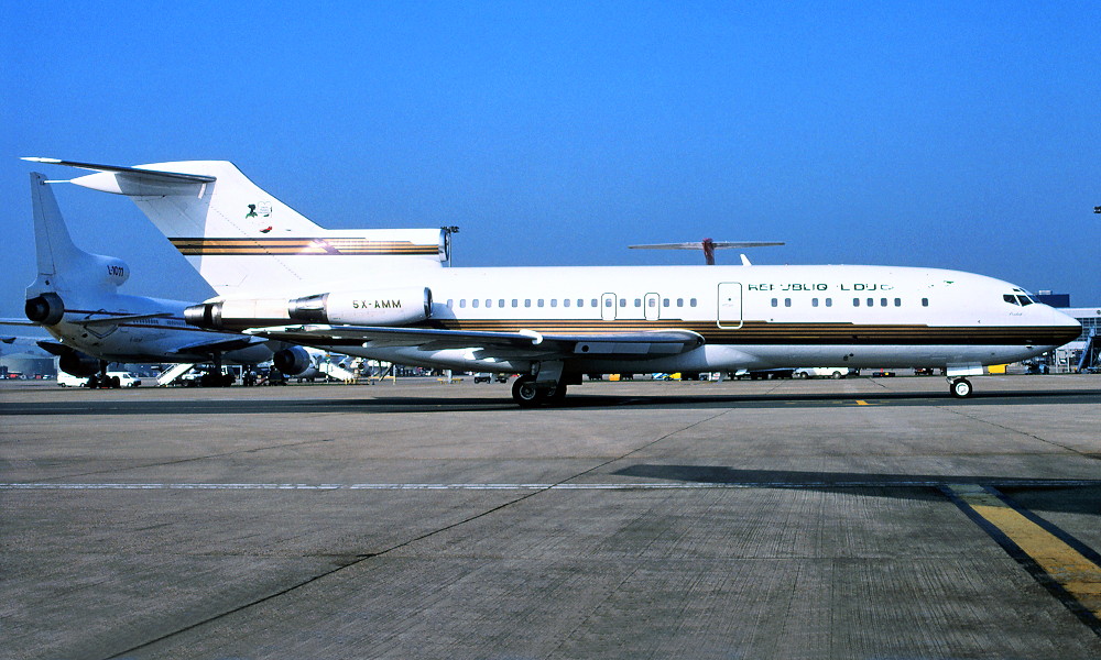 5X-AMM. Triangle Airlines - in the standard livery with faded 'Republique du Congo' titles at an unknown airport, March 1997. (R. N. Smith Collection Copyright Image 4610-544.) |