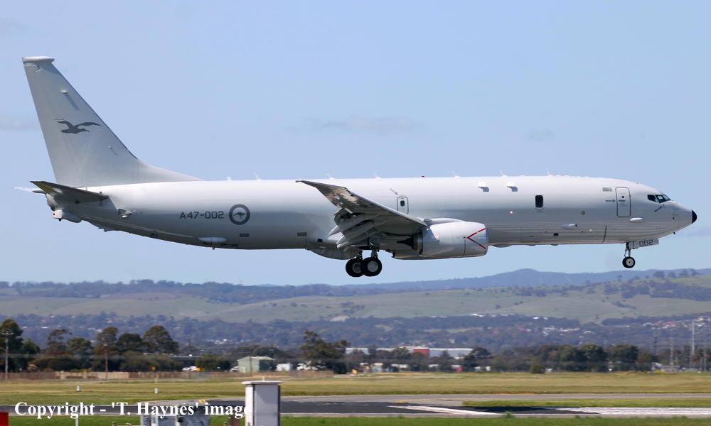 This aircraft was ordered new under Project Air 2B for the Royal Australian Air Force - February 2014 It was the second of fifteen aircraft ordered by the Australian Government The Boeing P-8A Poseidon was based on the fuselage of the B-737-800 with the wings of the B-737-900 Powered by CFM International CFM56-7B27E engines Entered onto the United States Aircraft Register as N956DS - April 19, 2016 Registered to Boeing Aircraft Company, Renton, Washington Rolled off the production line at Seattle (Boeing Field) - April 2016 First flown Seattle (Renton) - Seattle (Boeing Field) as 'N956DS' using callsign 'BOE174' - September 02, 2016 Accepted by the United States Navy for the Royal Australian Air Force at Seattle (Boeing Field) - September 02, 2016 The aircraft untook three other pre-delivery flights whilst at Boeing Field as 'BOE174' - dates unknown The aircraft spent 174 days in pre-delivery tests and the installation of military equipment Cancelled from the United States Aircraft Register - October 10, 2016 Entered onto the Australian Military Aircraft Rergistration as A47-002 - October 10, 2016 Ferried Seattle (Boeing Field) - NAS Jacksonville (Tower Field) - October 19, 2016 Accepted by the R.A.A.F. at NAS Jacksonville (Tower Field) as 'A47-002' - February 17, 2017 Departed NAS Jacksonville (Tower Field) on the delivery flight to Australia - March 06, 2017 It arrived at Brisbane (RAAF Amberley) on completion of the delivery flight from the United States - March 09, 2017 Ferried Brisbane (RAAF Amberley) - Adelaide (RAAF Edinburgh) - March 09, 2017 The aircraft was allocated to No. 11 Squadron, 92nd Wing, RAAF Edinburgh, South Australia Current with the Royal Australian Air Force |